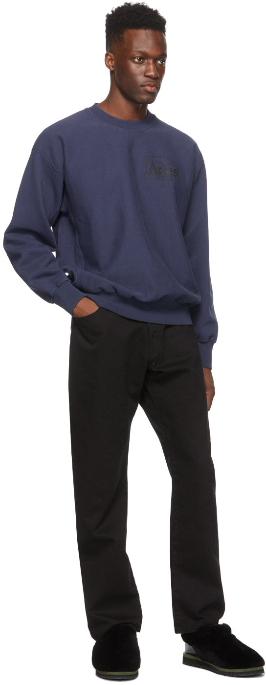 Long sleeve heavyweight cotton fleece sweatshirt in navy. Rib knit crewneck collar and side-seams. Logo graphic printed in black at chest. Rib knit cuffs and hem. Dropped shoulders. Supplier color: Navy 100% cotton. Brand: Aries