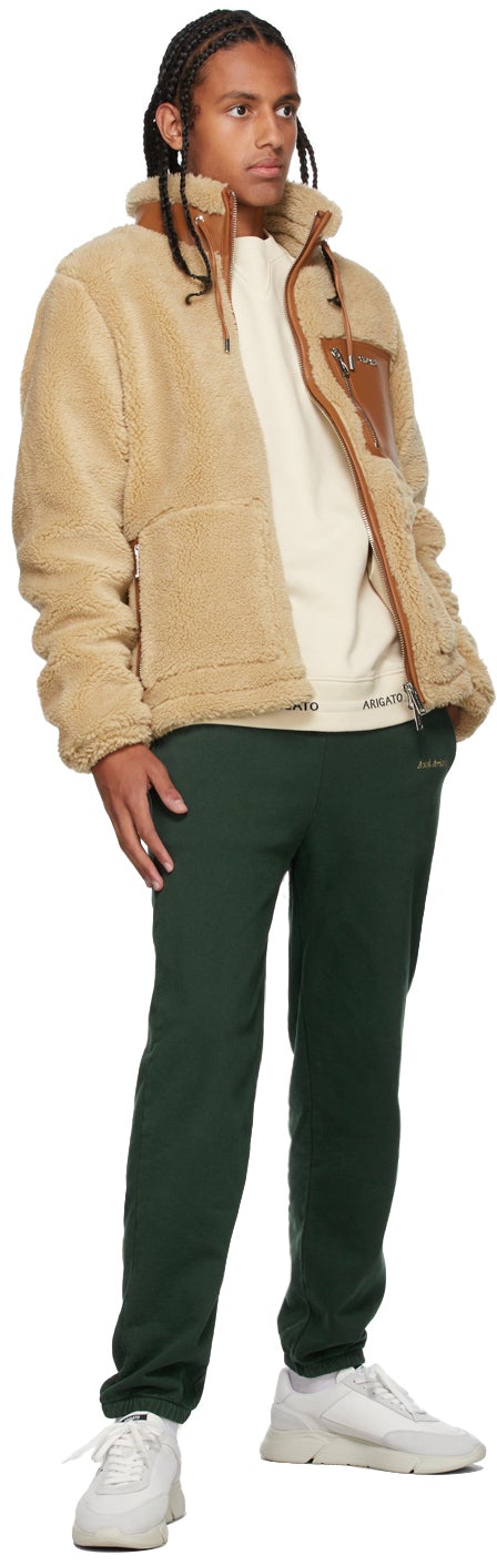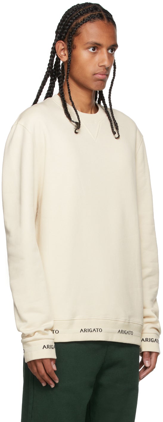Long sleeve organic cotton fleece sweatshirt in beige. Rib knit crewneck collar. Jacquard knit logo in black at rib knit cuffs and hem. Supplier color: Pale beige 100% organic cotton. Brand: Axel Arigato