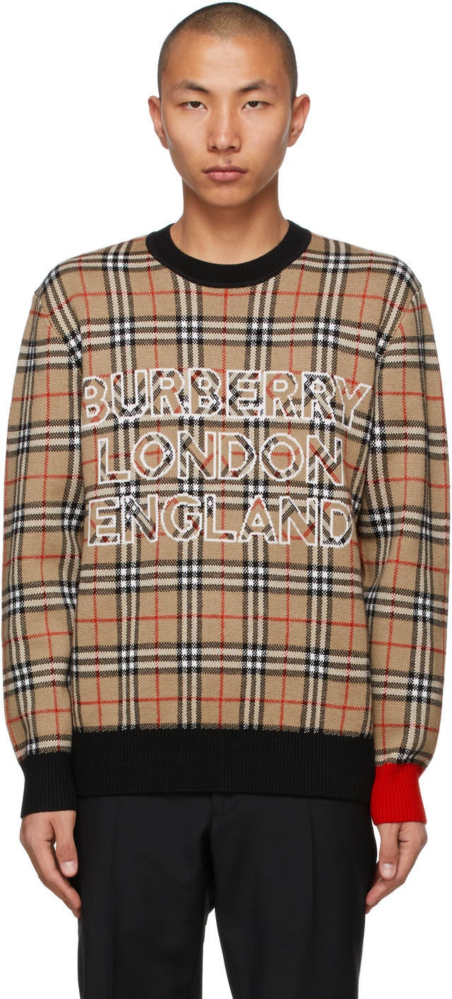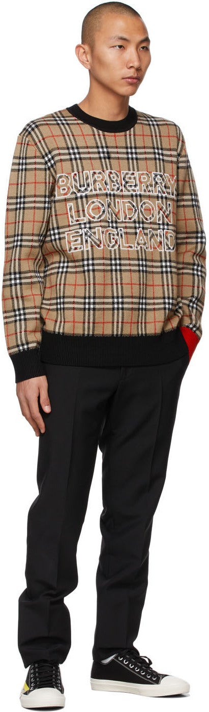 Long sleeve jacquard woven wool and cotton-blend sweater in beige featuring signature check pattern in black, red, and white. Rib knit crewneck collar and hem in black. Jacquard woven logo in white at front. Mismatched rib knit cuffs in black and red. Supplier color: Archive beige Body: 77% wool, 23% cotton. Trim: 90% wool, 9% polyamide, 1% elastane. Brand: Burberry