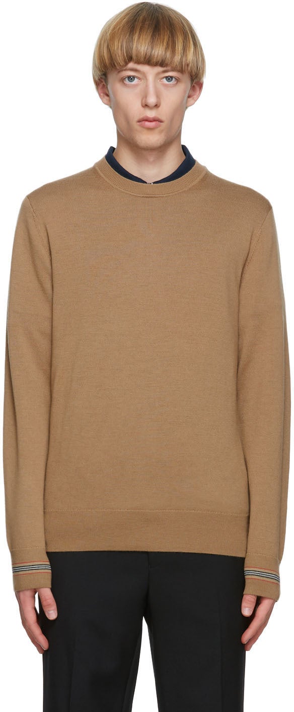 Long sleeve knit merino wool sweater in beige. Rib knit crewneck collar, cuffs, and hem. Signature stripes in red, black, and white at cuffs. Supplier color: Camel 100% merino wool. Brand: Burberry