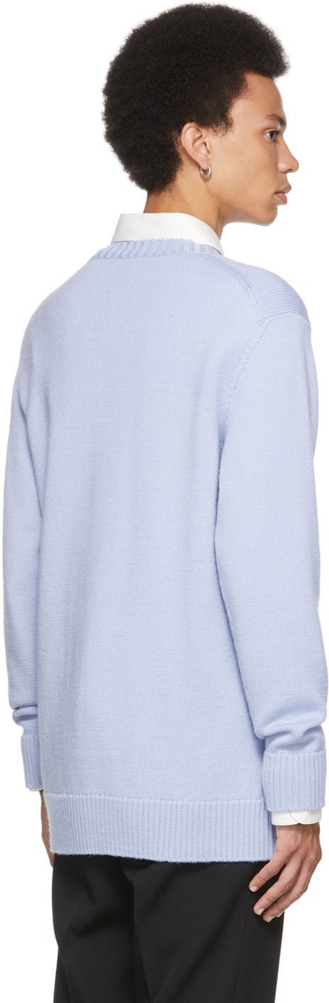 Long sleeve knit wool sweater in blue. Rib knit crewneck collar, cuffs, and hem. Intarsia graphic knit in multicolor at front. Supplier color: Pale blue Body: 100% wool. Trim: 53% acrylic, 47% wool. Brand: Burberry