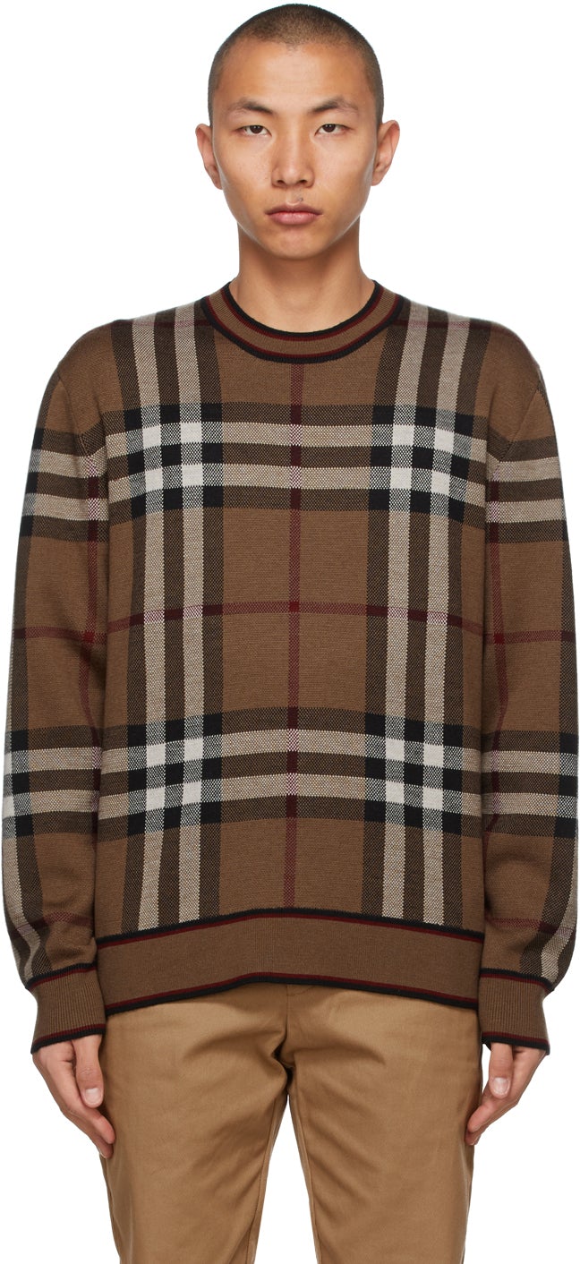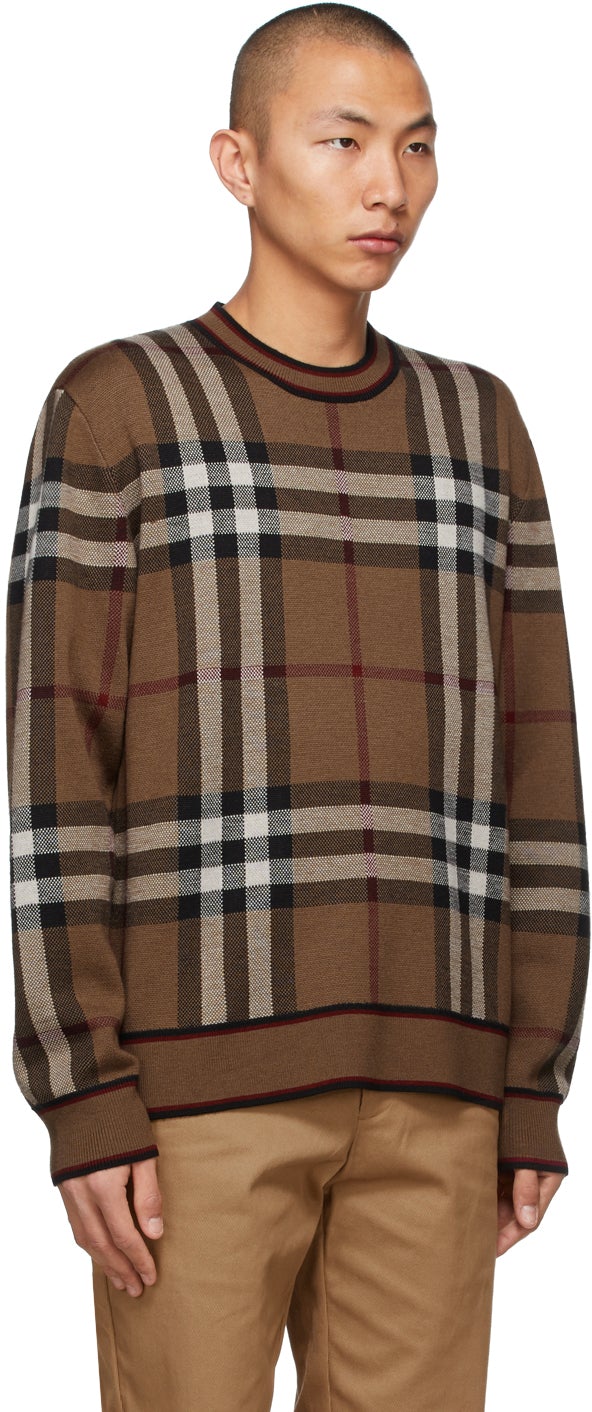 Long sleeve knit merino wool sweater in brown featuring jacquard woven check pattern in black, beige, and burgundy throughout. Rib knit crewneck collar, cuffs, and hem striped in black, burgundy, and brown. Supplier color: Birch brown Body: 100% merino wool. Trim: 97% merino wool, 2% polyamide, 1% elastane. Brand: Burberry