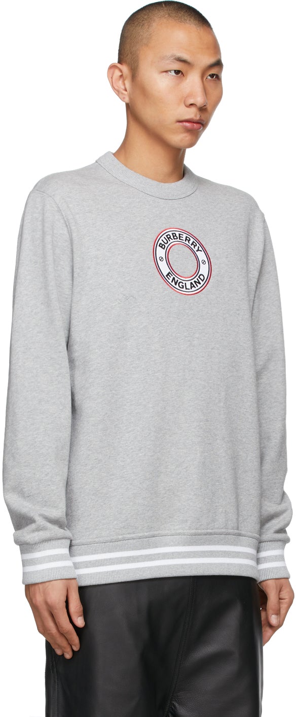 Long sleeve French terry sweatshirt in grey. Rib knit crewneck collar. Embroidered logo appliqué in white, black, and red at front and back. Rib knit cuffs and hem striped in white and grey. Supplier color: Pale grey melange 100% cotton. Brand: Burberry
