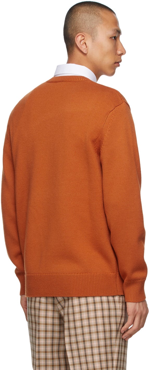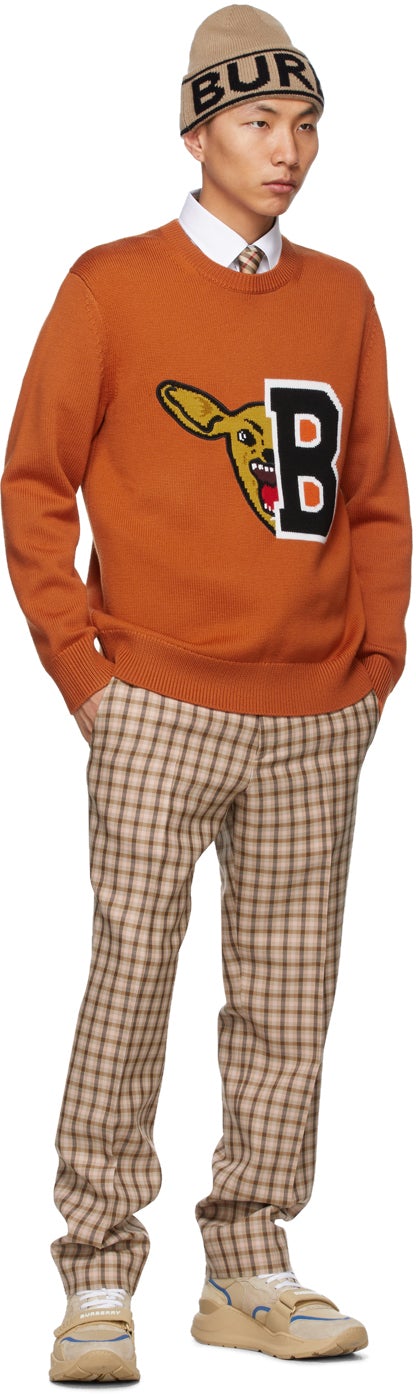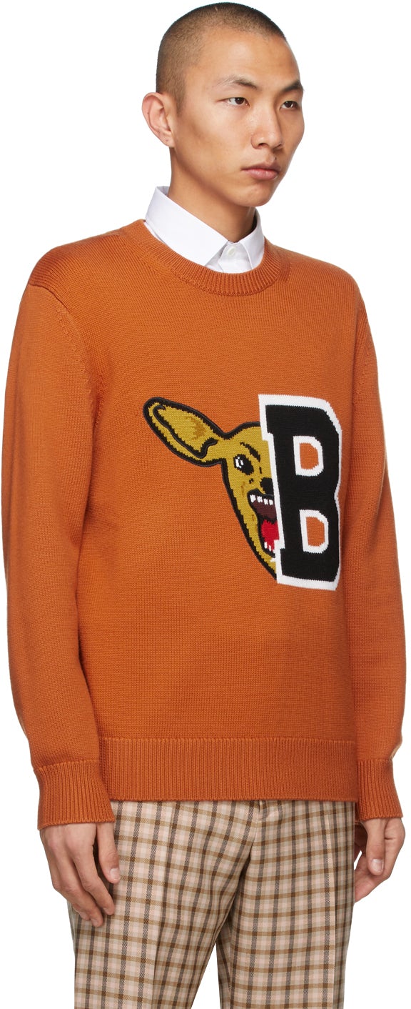 Long sleeve knit wool sweater in orange. Rib knit crewneck collar, cuffs, and hem. Jacquard woven graphic in multicolor at front. Supplier color: Burnt orange Body: 100% wool. Trim: 95% wool, 4% polyamide, 1% elastane. Brand: Burberry