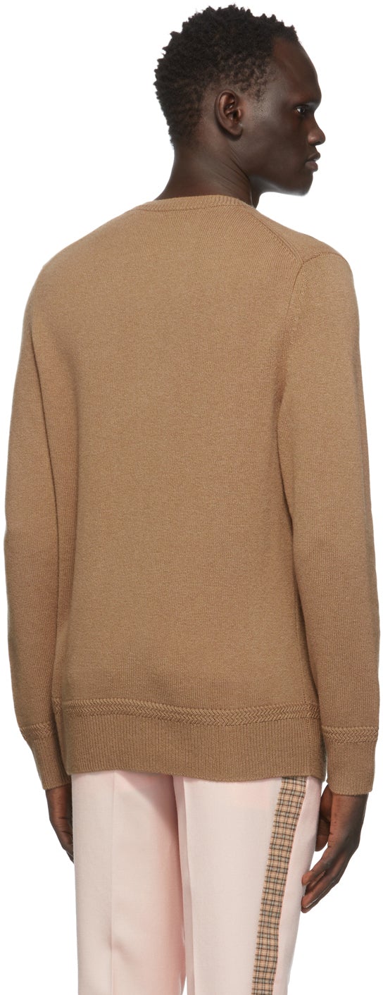 Long sleeve knit cashmere sweater in tan. Rib knit crewneck collar, cuffs, and hem. Tonal logo embroidered at chest. Supplier color: Camel Body: 100% cashmere. Trim: 98% cashmere, 1% polyamide, 1% elastane. Brand: Burberry