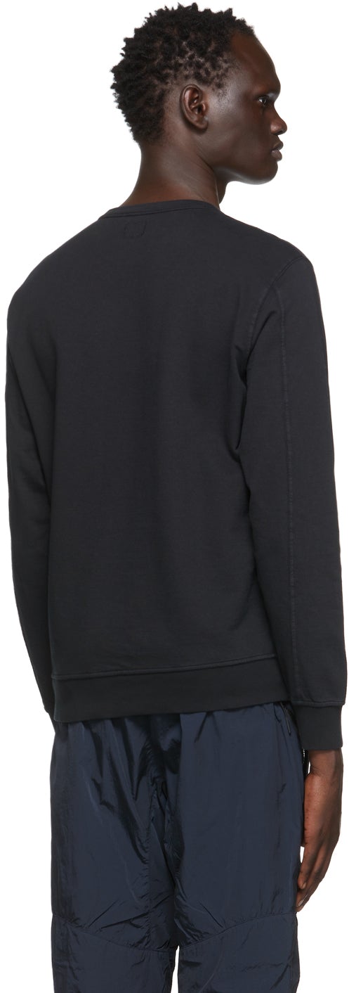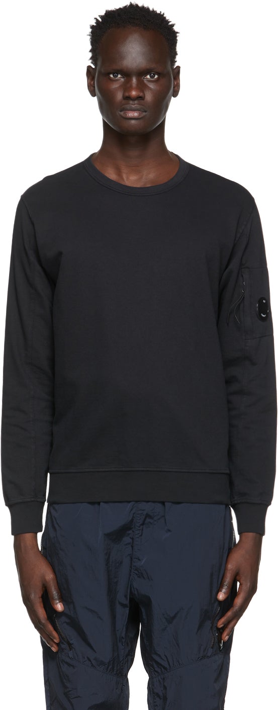 Long sleeve garment-dyed French terry sweatshirt in black. Rib knit crewneck collar, cuffs, and hem. Zippered pocket and logo hardware at sleeve. Tonal hardware. Supplier color: Black 100% cotton. Brand: C.P. Company