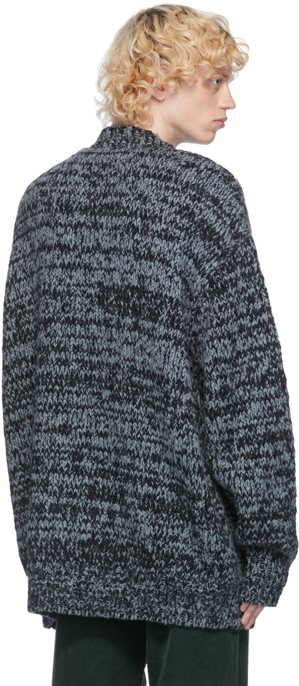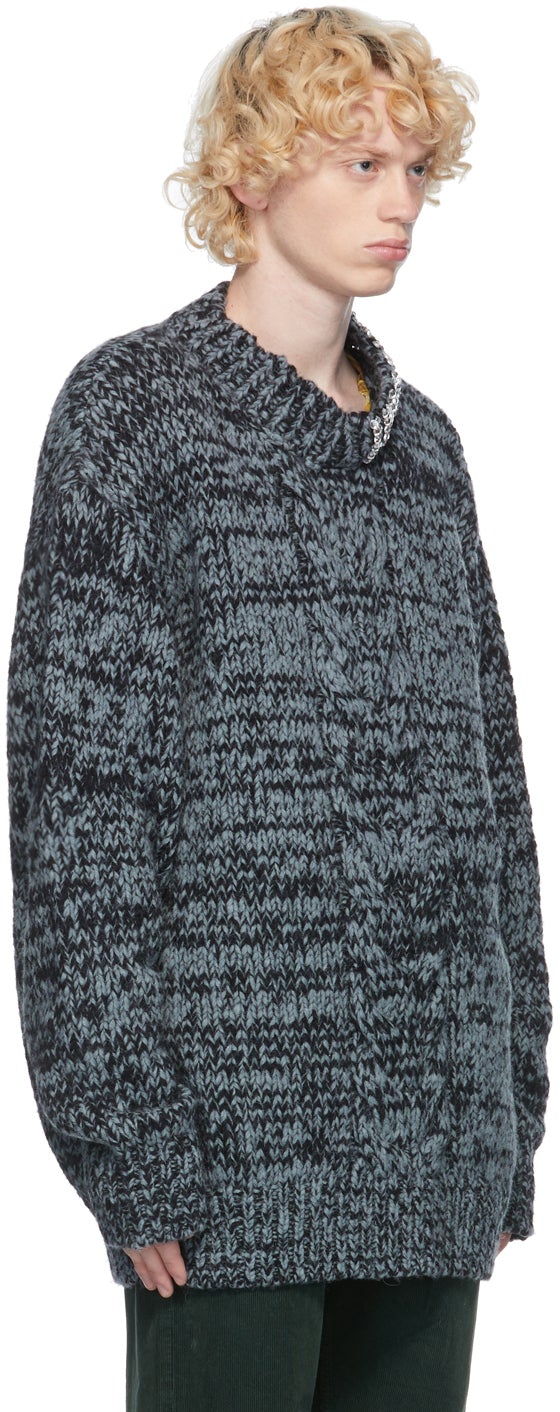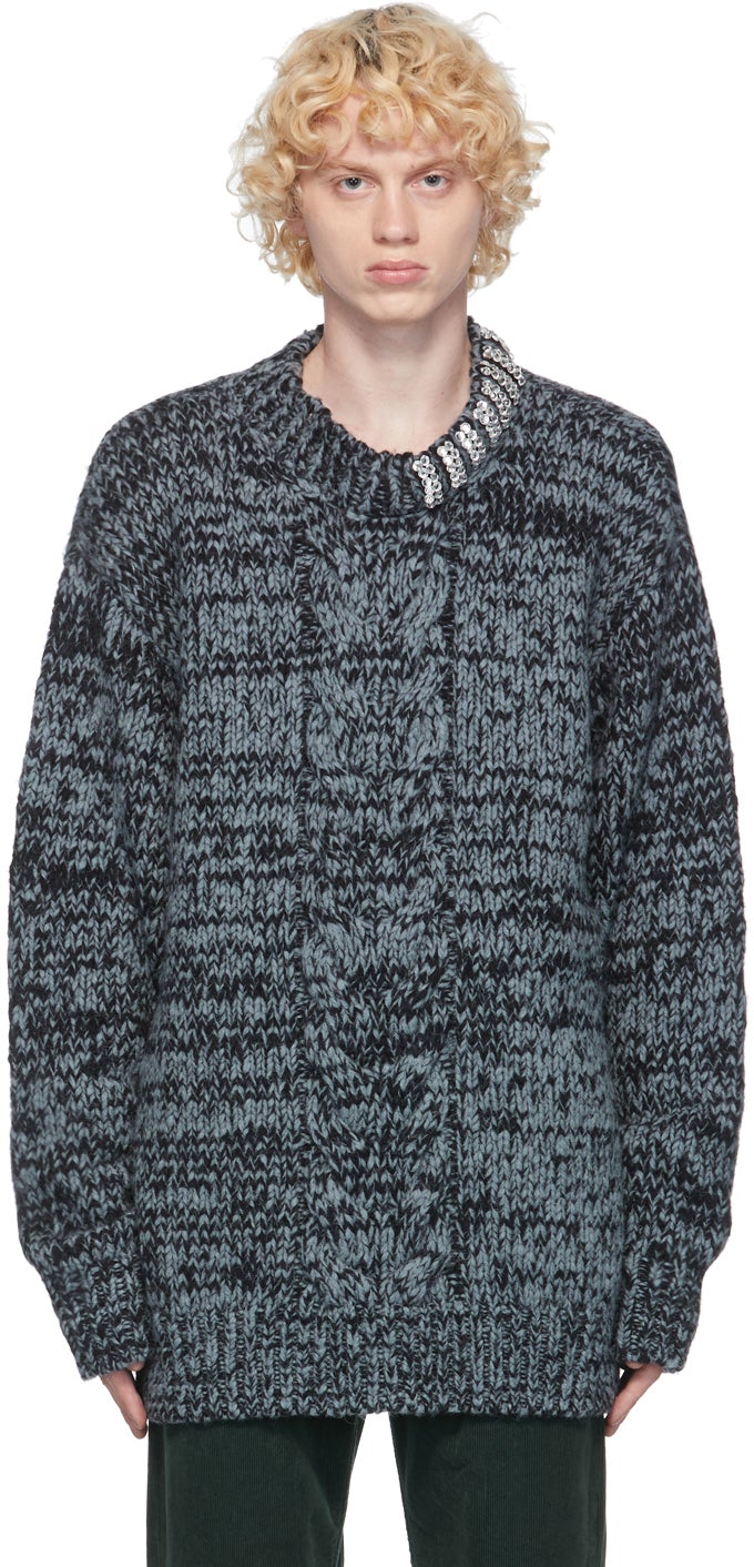 Long sleeve knit merino wool-blend sweater marled in blue and black. Rib knit crewneck collar featuring transparent rhinestone detailing. Cable knit pattern at front. Rib knit cuffs and hem. Supplier color: Raf blue 58% merino wool, 25% polyamide, 17% alpaca. Brand: Dries Van Noten