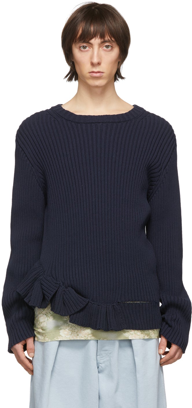Long sleeve rib knit cotton and nylon-blend sweater in navy. Crewneck collar. Modified twisted-trim construction with slit at hem. Supplier color: Navy 73% cotton, 27% polyamide. Brand: Dries Van Noten