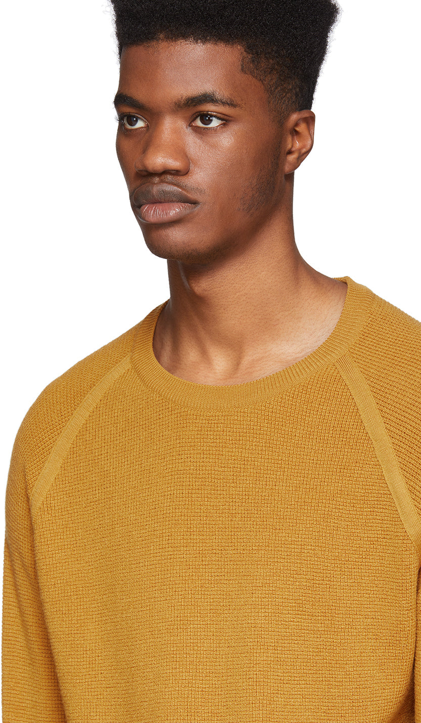 Long sleeve knit wool sweater in orange. Raglan sleeve. Rib knit crewneck collar, cuffs, and hem. Supplier color: Rust 100% wool. Brand: Eidos