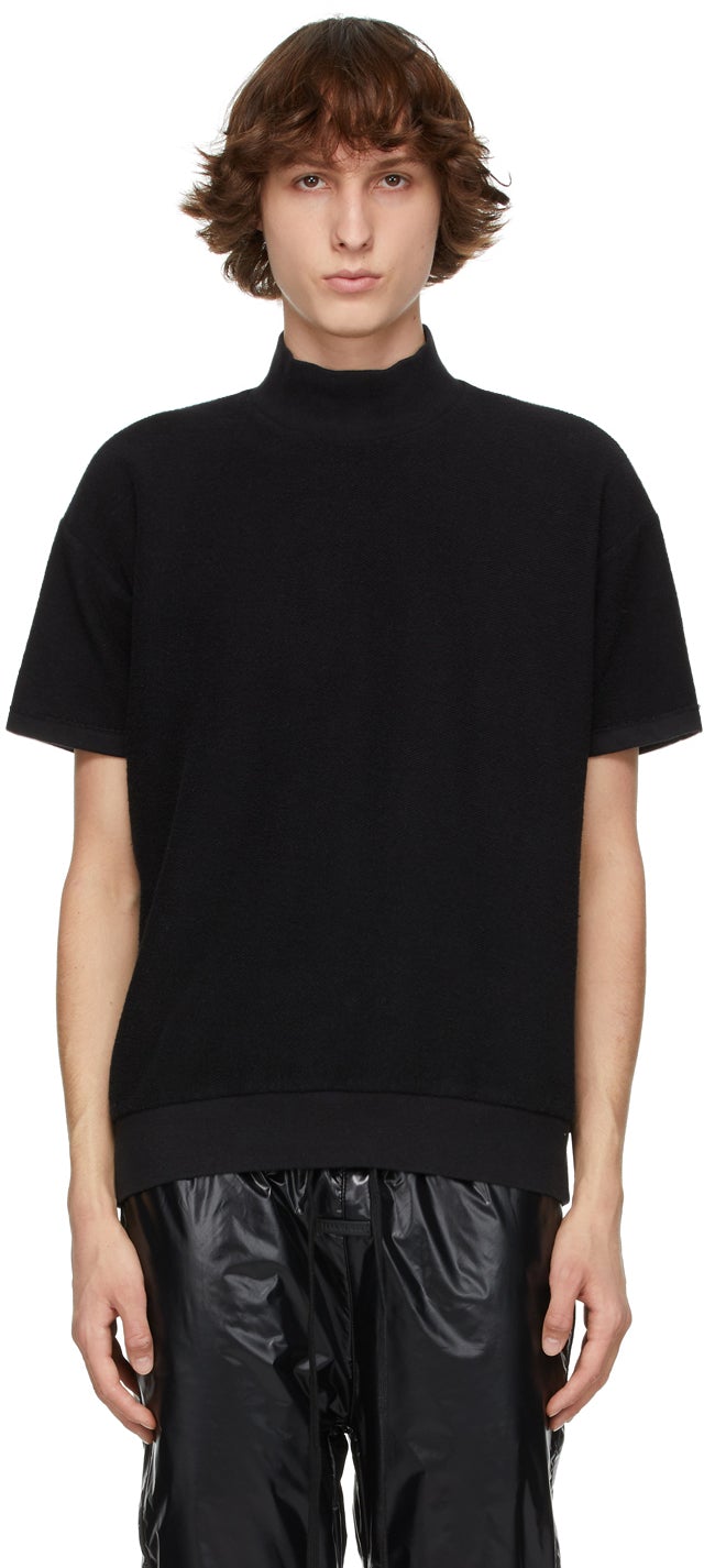 Short sleeve French terry sweatshirt in black. Reversed construction. Rib knit mock neck collar, cuffs, and hem. Tonal leather logo patch at back collar. Supplier color: Black 100% cotton. Brand: Fear of God