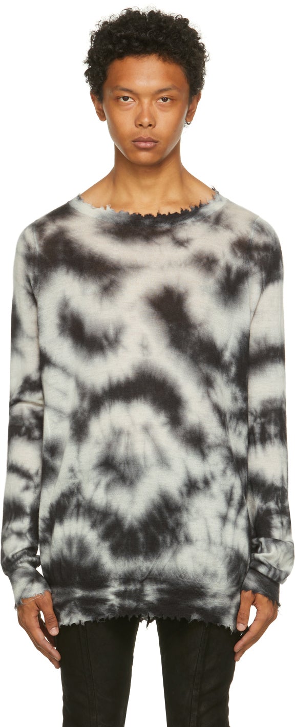 Long sleeve knit cashmere sweater in grey featuring tie-dye pattern in black. Raw edges throughout. Rib knit crewneck collar, cuffs, and hem. Central seam at back. Each item is unique. Please note that coloration may vary. Supplier color: Heather grey 100% cashmere. Brand: FREI-MUT