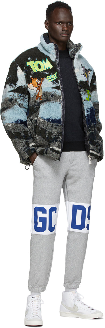 Long sleeve stretch wool-blend sweatshirt in black. Rib knit mock neck collar, cuffs, and hem. Jacquard knit stripes and logo in white at sleeves. Supplier color: Black 33% wool, 33% acrylic, 30% polyamide, 3% elastane. Brand: GCDS