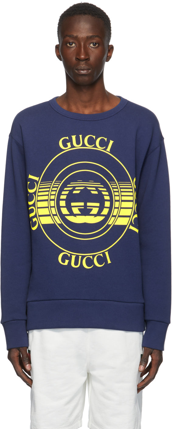 Long sleeve French terry sweatshirt in blue. Rib knit crewneck collar, cuffs, and hem. Logo printed in yellow at chest. Supplier color: Ink/Yellow 100% cotton. Brand: Gucci