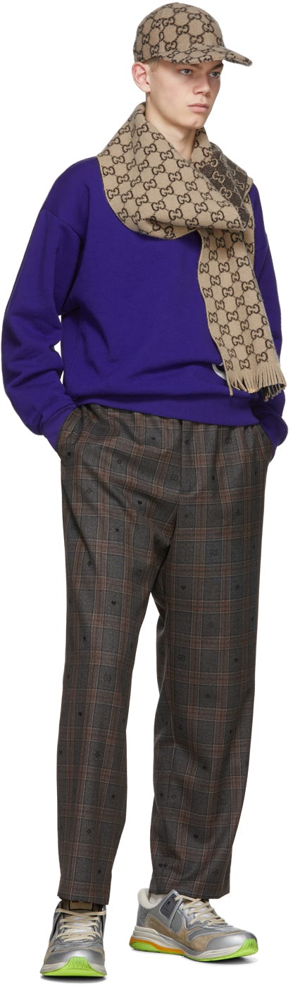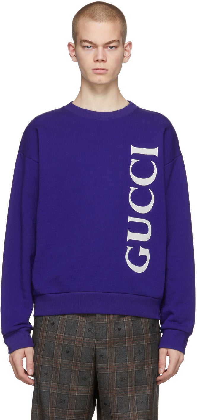 Long sleeve French terry sweatshirt in blue. Rib knit crewneck collar, cuffs, and hem. Logo printed in white at front. Supplier color: Marino/White 100% cotton. Brand: Gucci