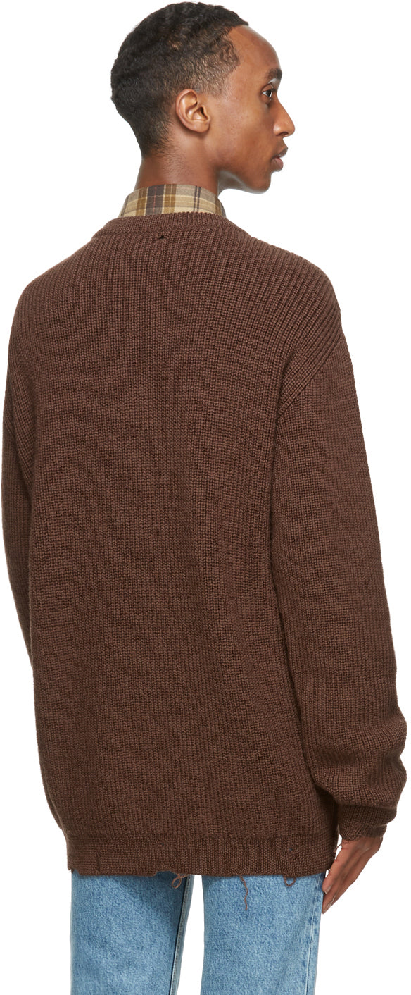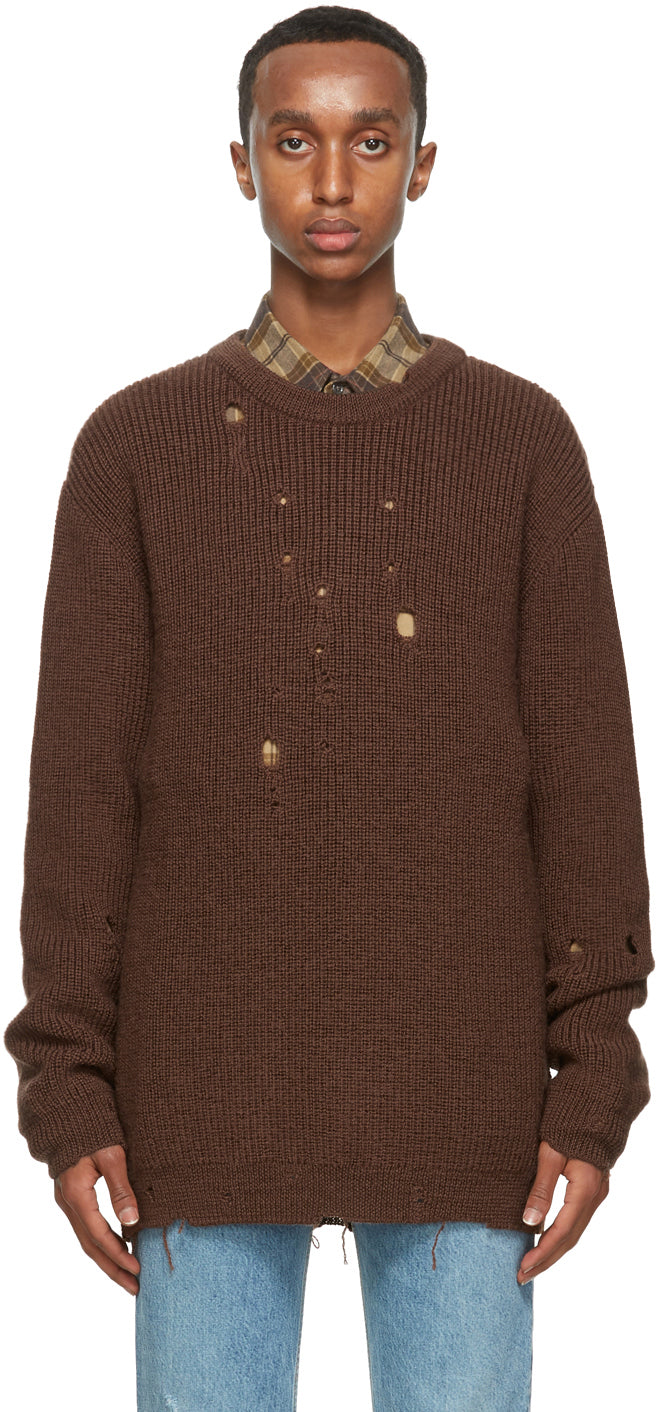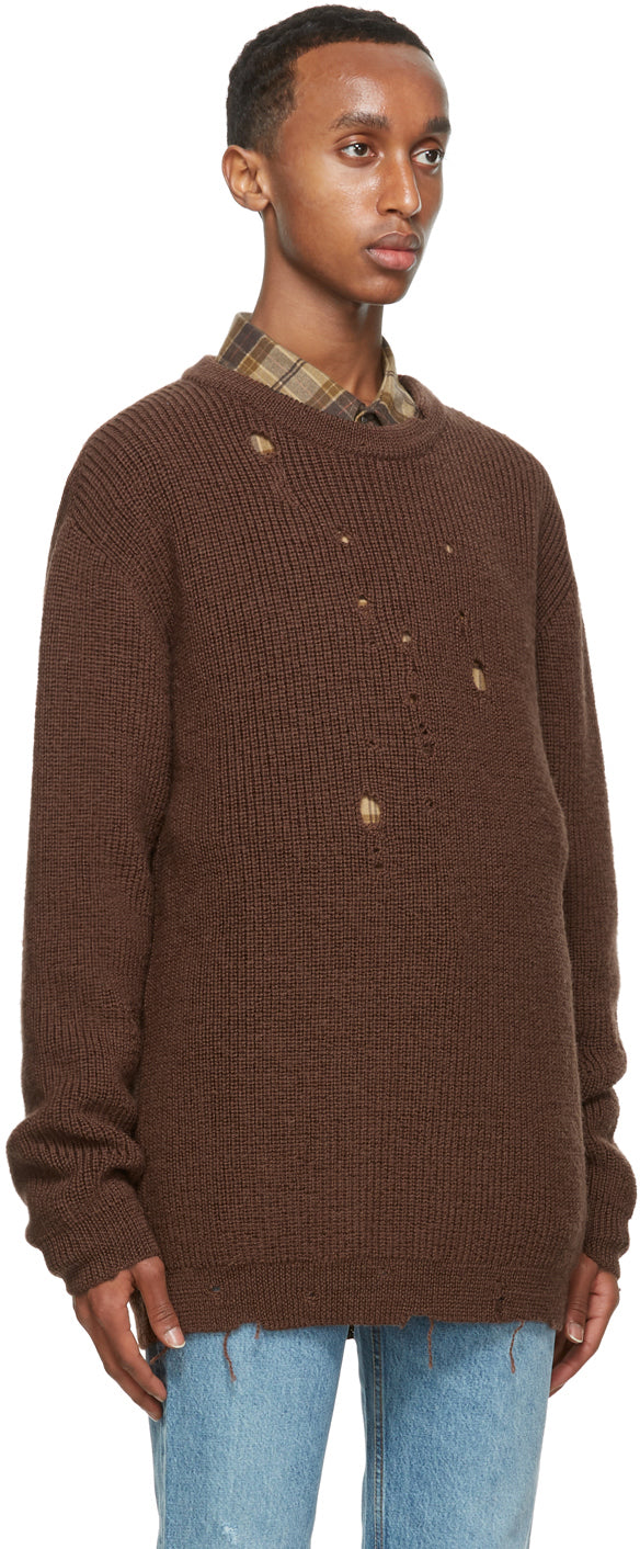 Long sleeve rib knit wool sweater in brown. Distressing throughout. Rib knit crewneck collar, cuffs, and hem. Supplier color: Brown 100% wool. Brand: Gucci