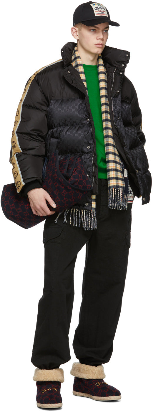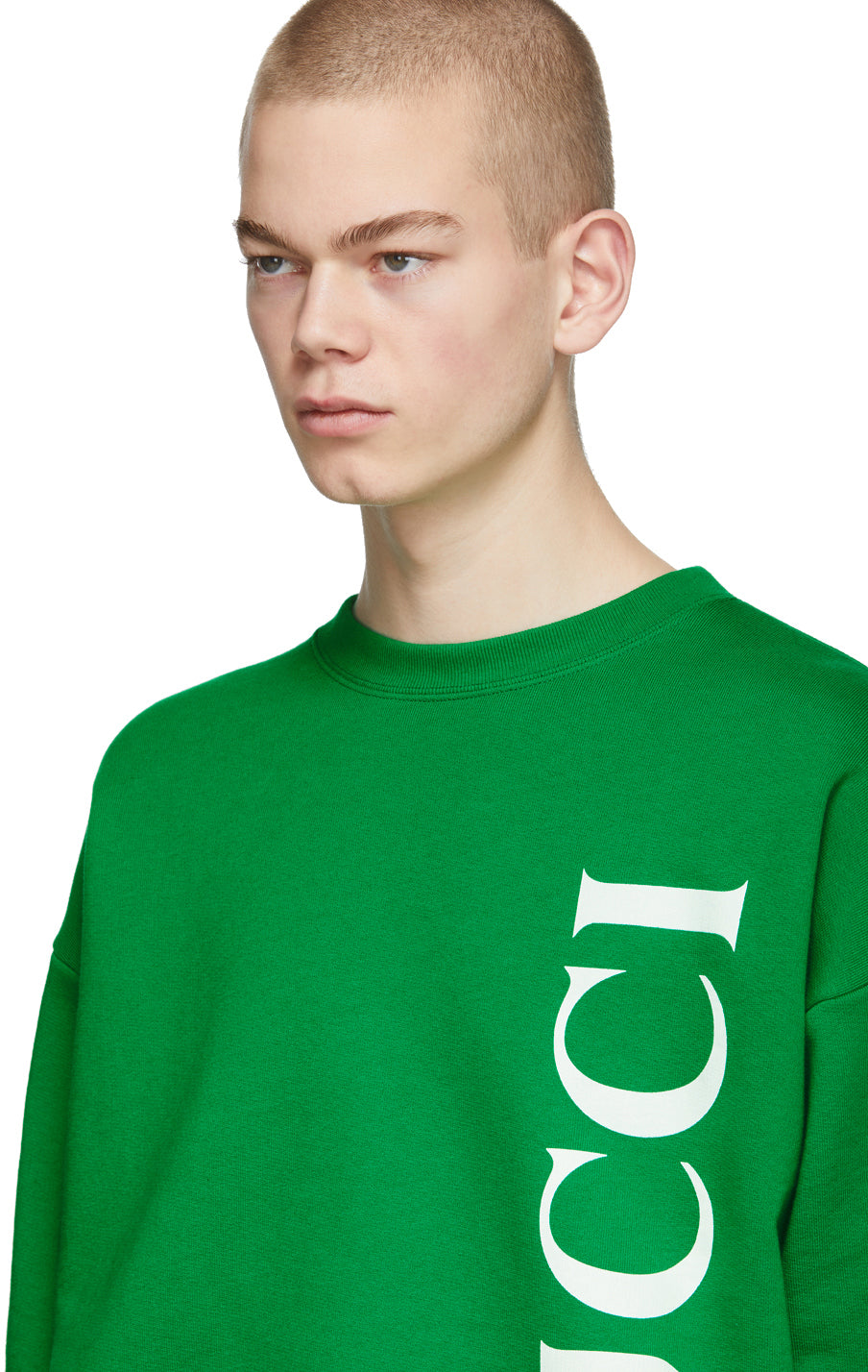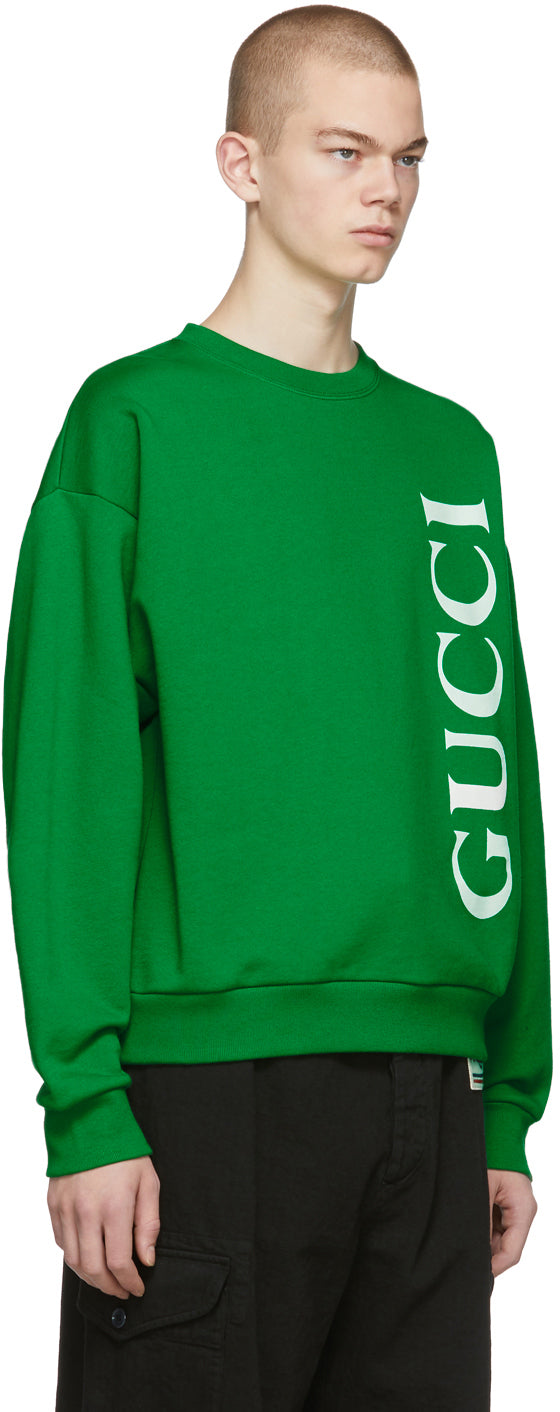 Long sleeve French terry sweatshirt in green. Rib knit crewneck collar, cuffs, and hem. Logo printed in white at front. Supplier color: Green 100% cotton. Brand: Gucci