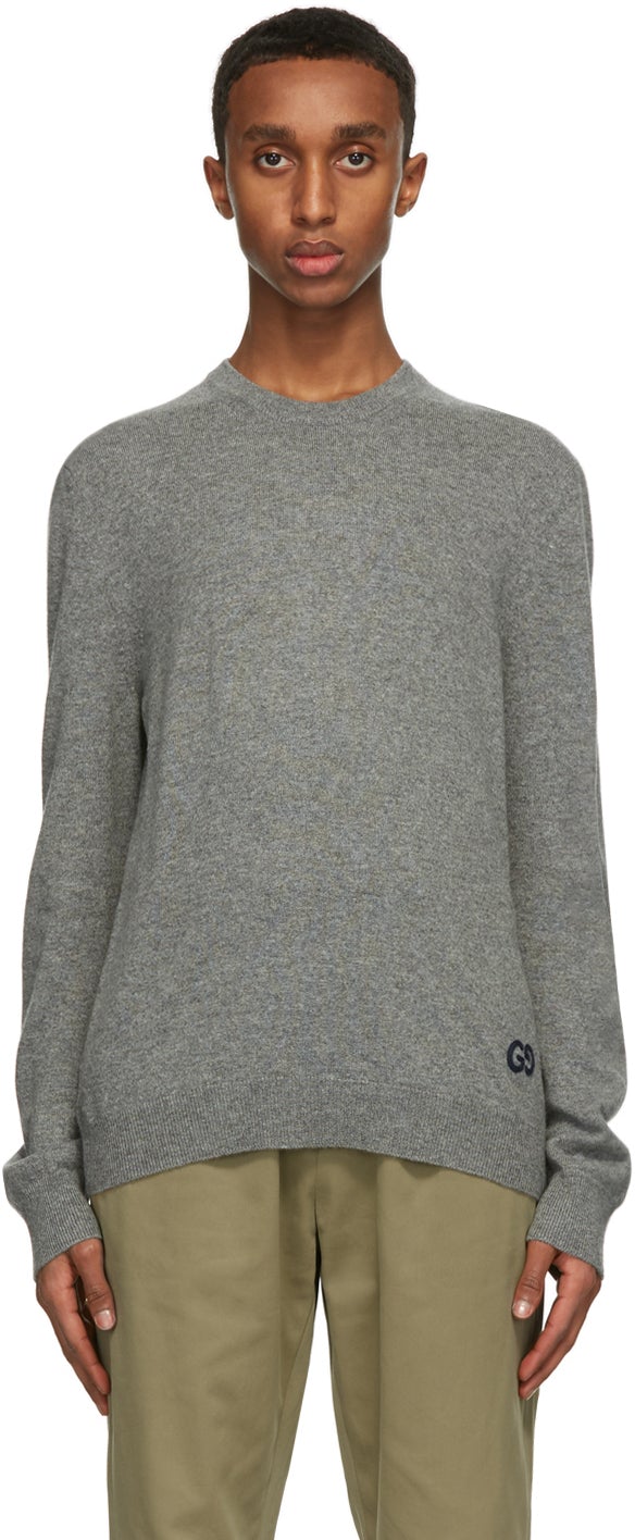 Long sleeve knit cashmere sweater in grey. Rib knit crewneck collar, cuffs, and hem. Logo embroidered in navy at hem. Supplier color: Grey/Mix Body: 100% cashmere. Trim: 50% acrylic, 50% wool. Brand: Gucci