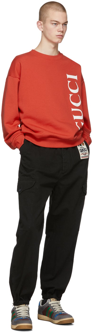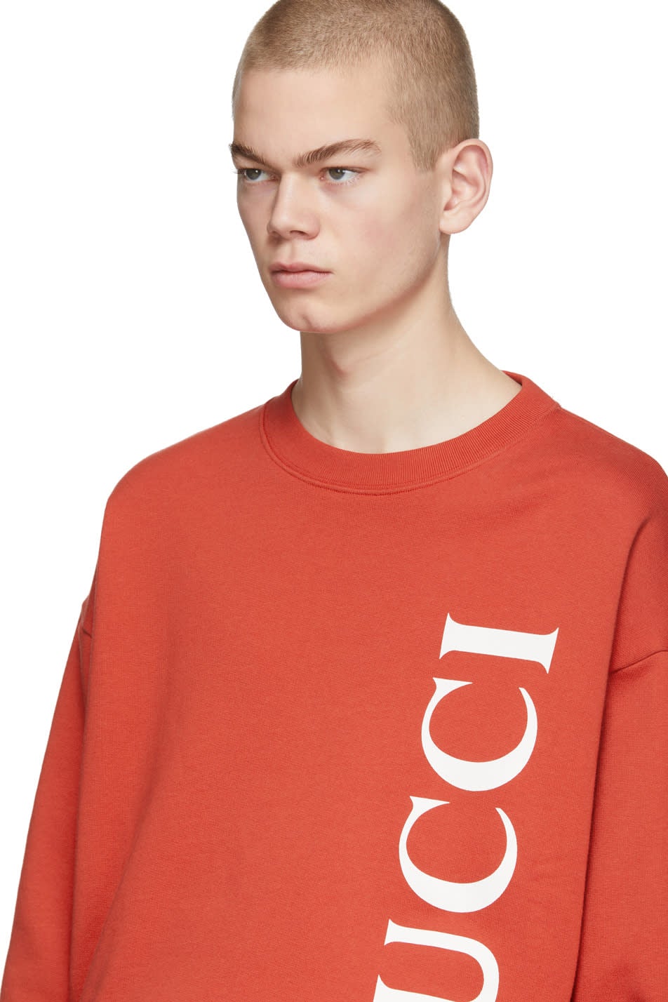 Long sleeve French terry sweatshirt in red. Rib knit crewneck collar, cuffs, and hem. Logo printed in white at front. Supplier color: Red 100% cotton. Brand: Gucci