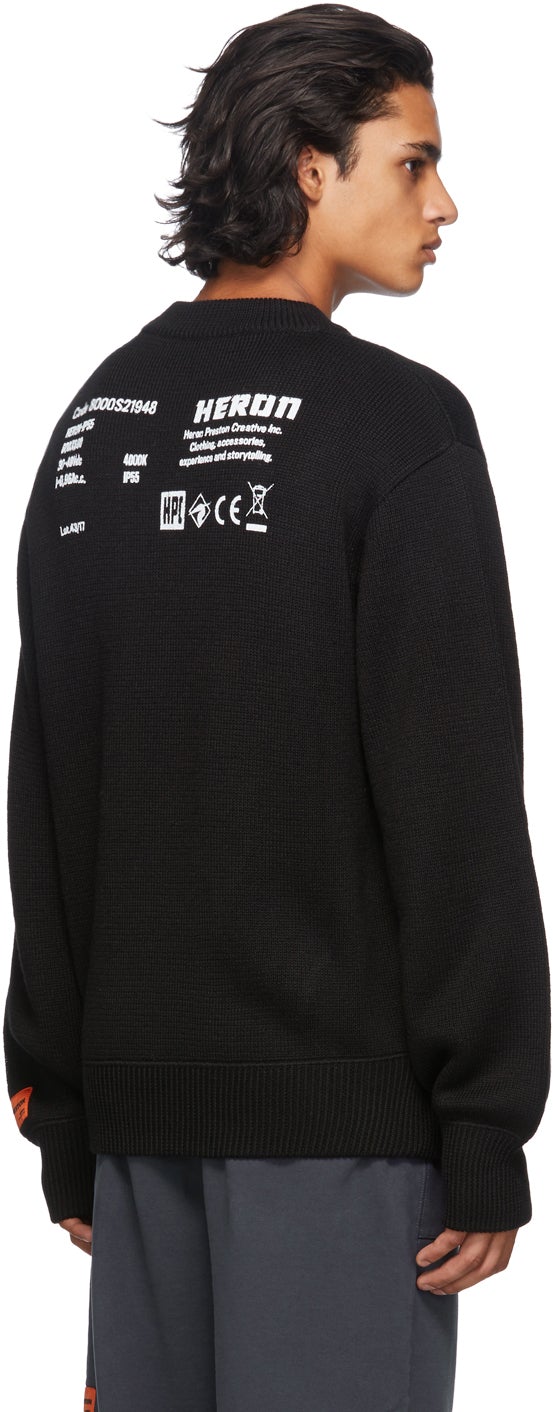 Long sleeve knit virgin wool-blend sweater in black. Rib knit crewneck collar, cuffs, and hem. Textile logo patch in orange and embroidered text in black at cuffs. Logo and text printed in white at back. Supplier color: Black 50% virgin wool, 50% acrylic. Brand: Heron Preston