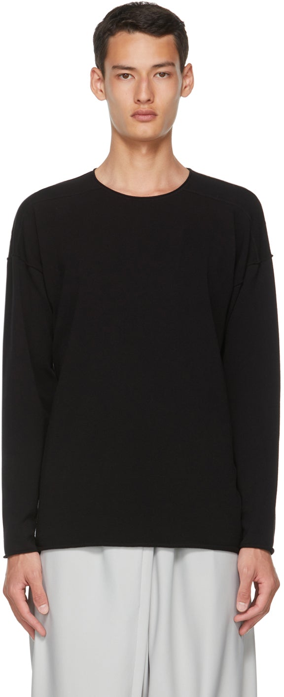 Long sleeve knit viscose-blend sweater in black. Raised seams throughout. Raw edge at crewneck collar, cuffs, and hem. Dropped shoulders. Supplier color: Black 67% viscose, 33% polyester. Brand: Isabel Benenato