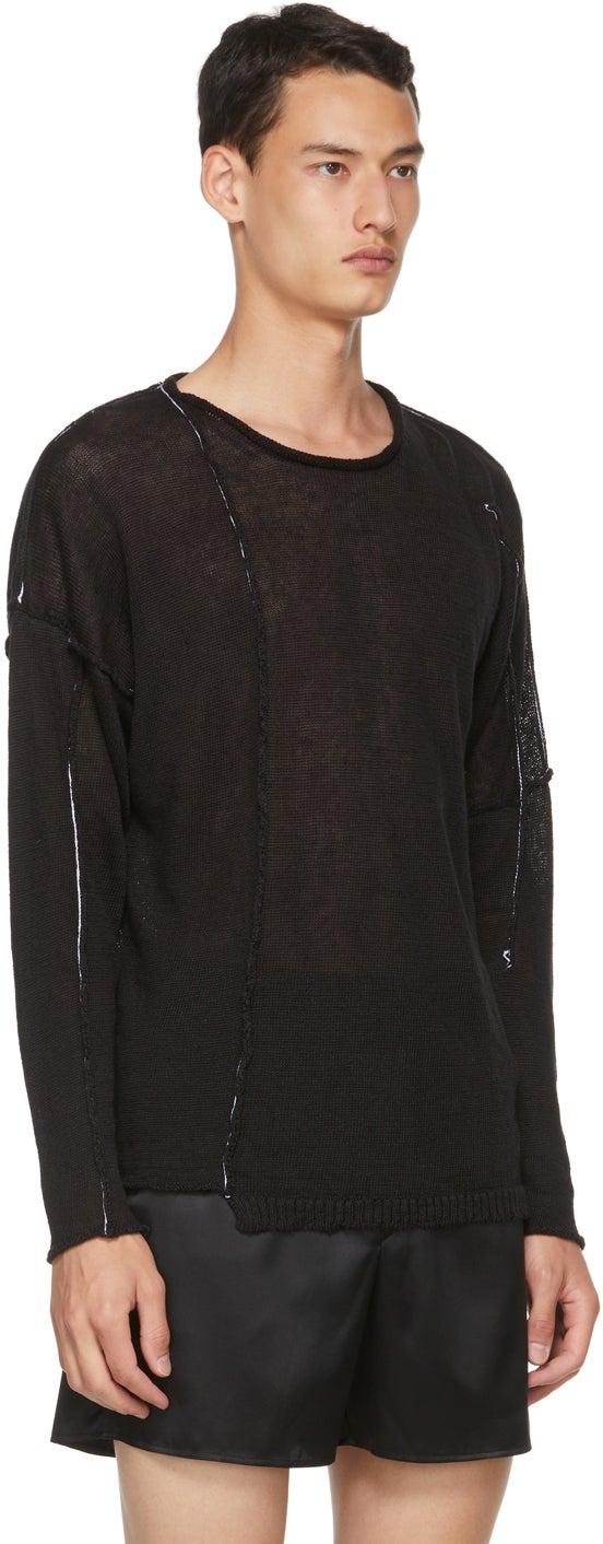 Long sleeve rib knit linen crewneck sweater in black. Exposed seams throughout featuring contrast stitching in white. Rolled collar and cuffs. Dropped shoulders. Rib knit front hem. Supplier color: Black 100% linen. Brand: Isabel Benenato