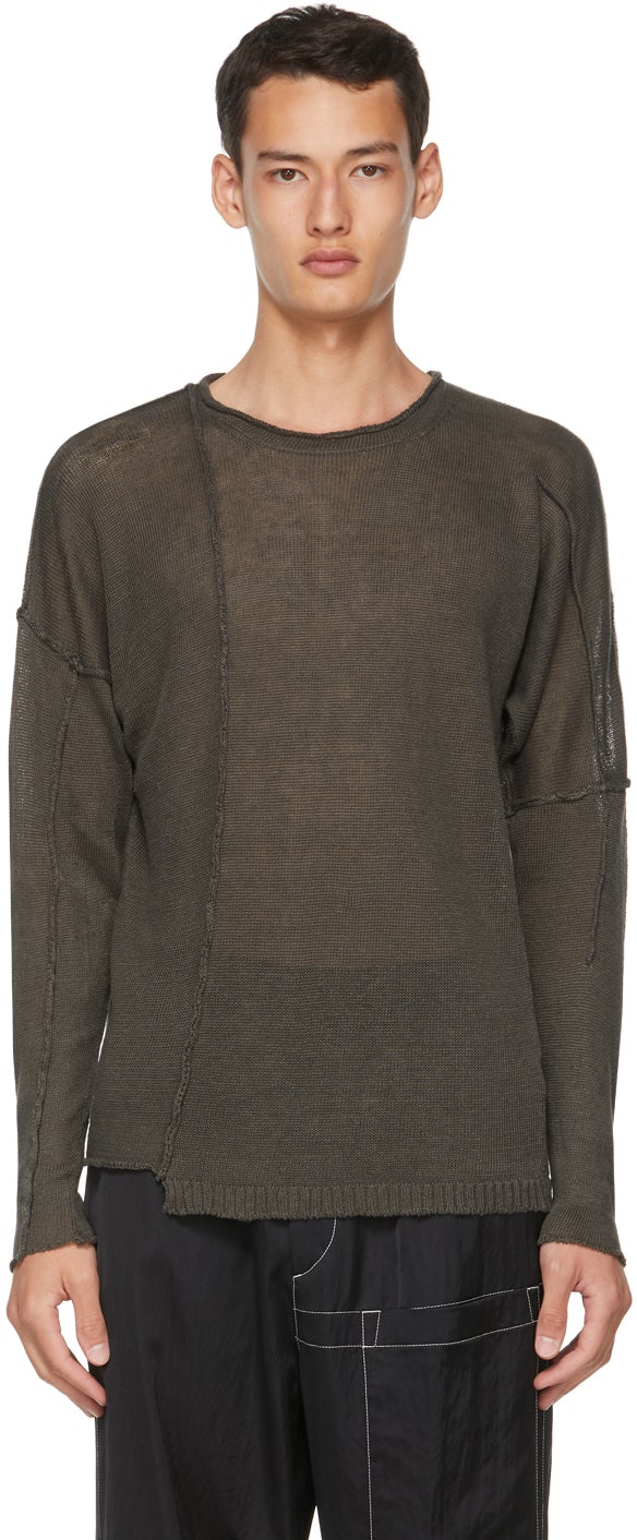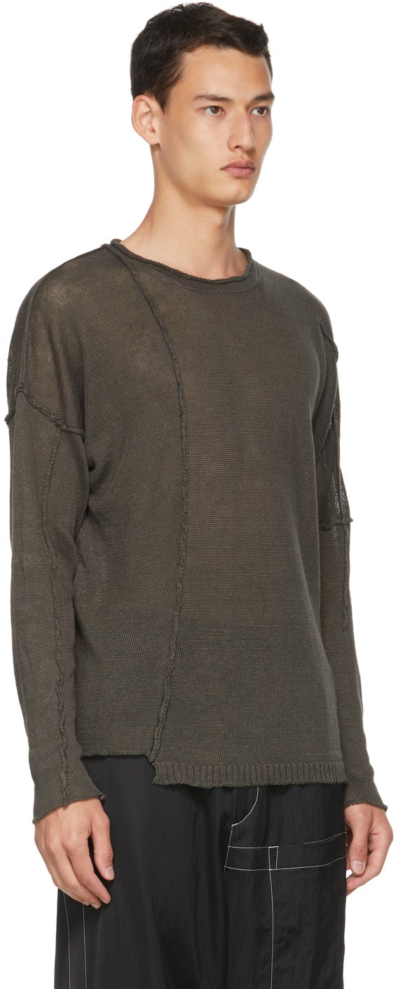 Long sleeve rib knit linen crewneck sweater in khaki. Exposed seams throughout featuring contrast stitching in black. Rolled collar and cuffs. Dropped shoulders. Rib knit front hem. Supplier color: Military green 100% linen. Brand: Isabel Benenato