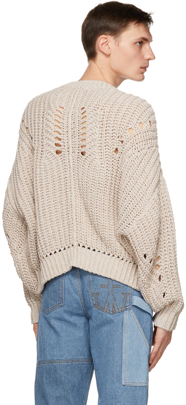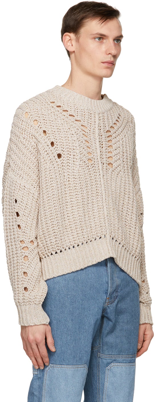 Long sleeve knit cotton-blend sweater in off-white. Open knit detailing throughout. Rib knit crewneck collar, cuffs, and hem. Dropped shoulders. Supplier color: Ecru 52% polyester, 48% cotton. Brand: Isabel Marant