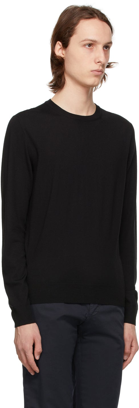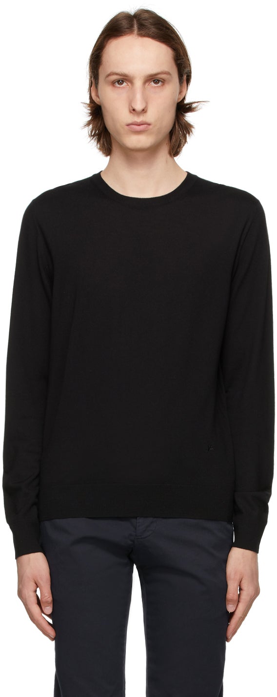Long sleeve knit merino wool sweater in black. Rib knit crewneck collar, cuffs, and hem. Tonal logo embroidered at waist. Supplier color: Black 100% merino wool. Brand: Isaia