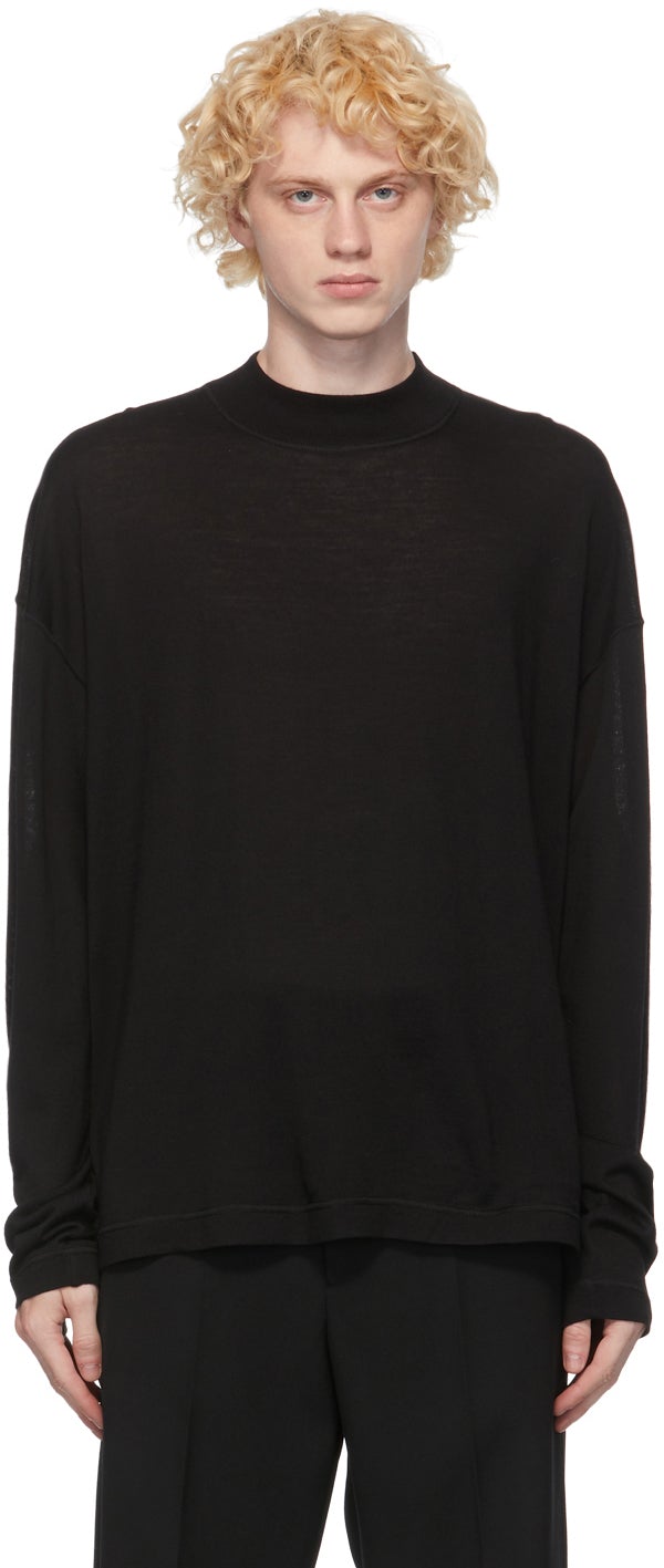 Long sleeve knit wool sweater in black. Rib knit crewneck collar, cuffs, and hem. Dropped shoulders. Supplier color: Black 100% wool. Brand: Jil Sander
