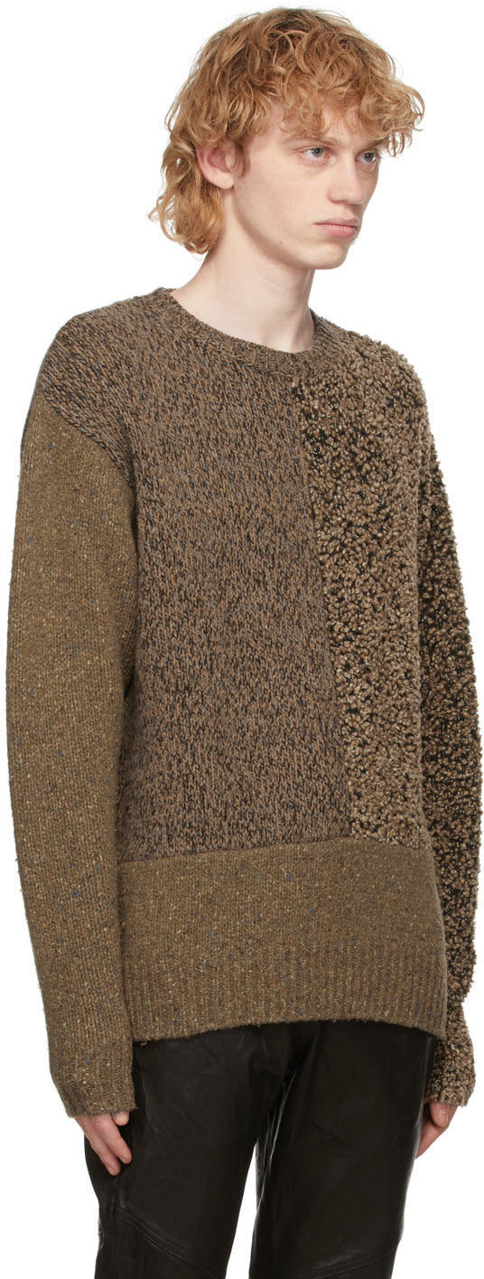 Long sleeve knit cashmere-blend sweater in brown. Rib knit crewneck collar, cuffs, and hem. Distressing at back hem. Supplier color: Taupe 58% cashmere, 23% wool, 12% nylon, 7% rayon. Brand: John Elliott