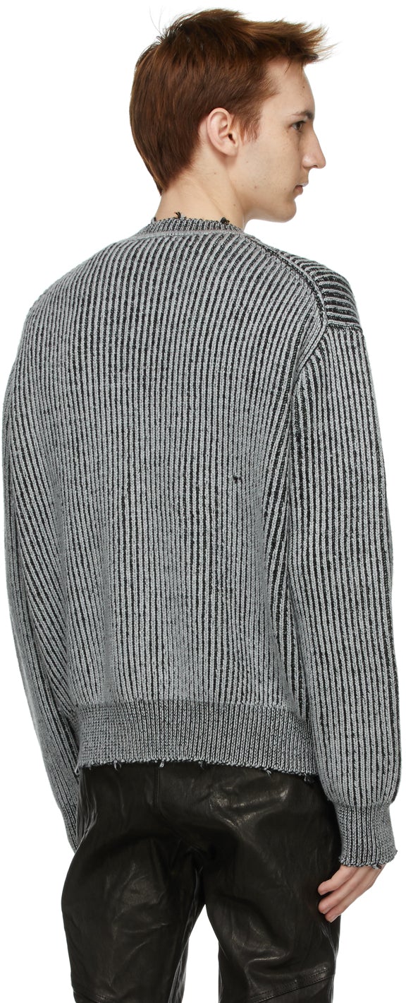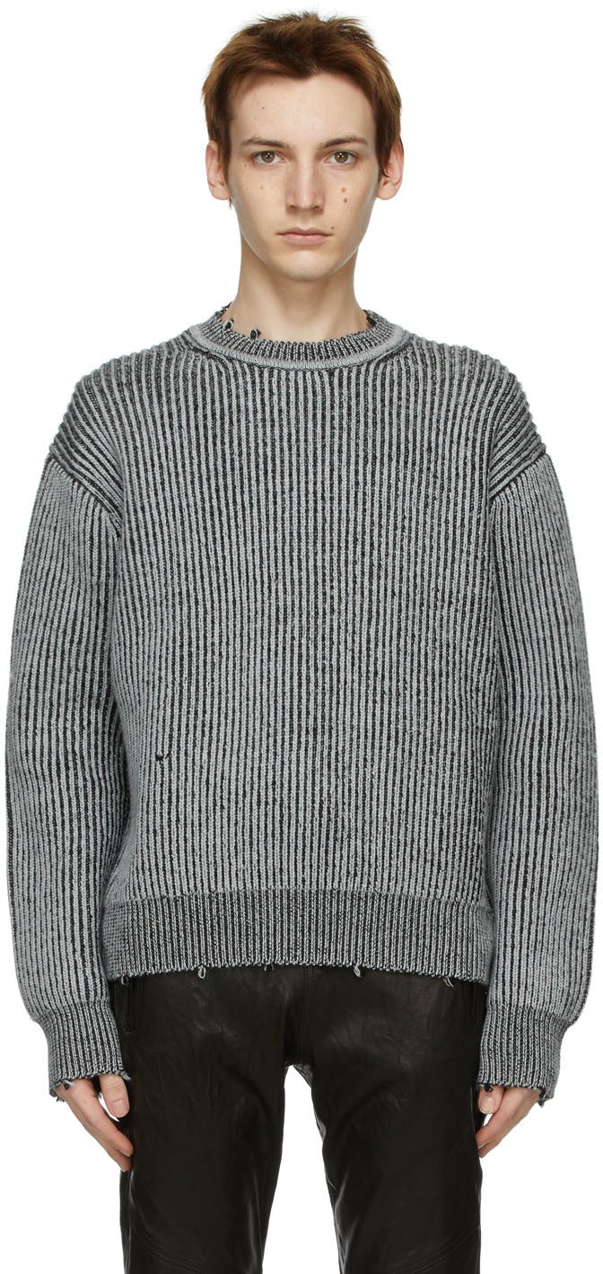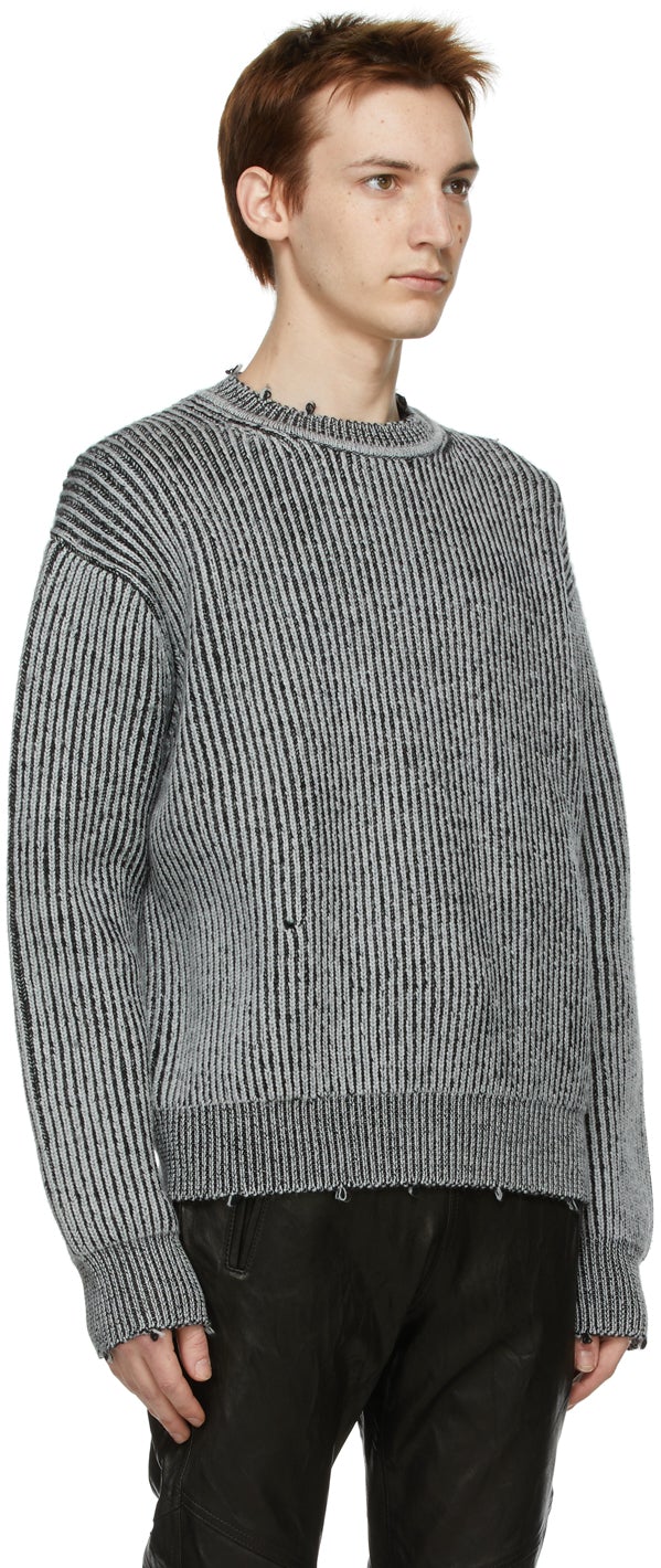 Long sleeve jacquard knit sweater in grey and black. Distressing throughout. Rib knit crewneck collar, cuffs, and hem. Supplier color: Ash 100% merino wool. Brand: John Elliott