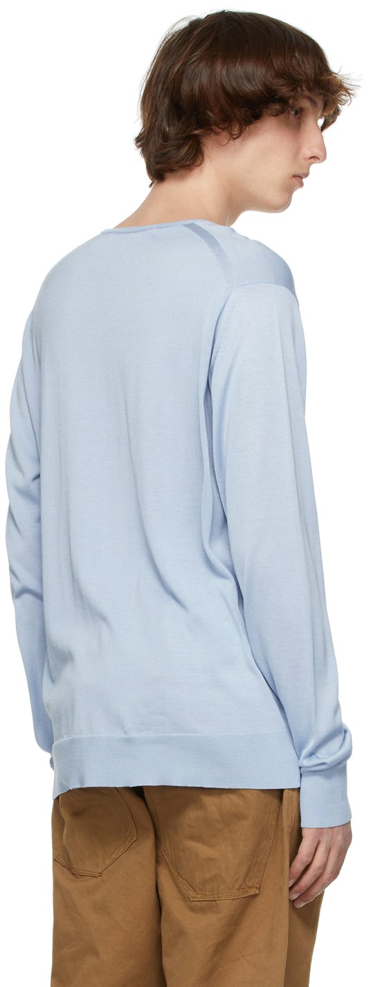 Long sleeve silk jersey sweater in blue. Rib knit crewneck collar, cuffs, and hem. Supplier color: Sax 100% silk. Brand: Junya Watanabe
