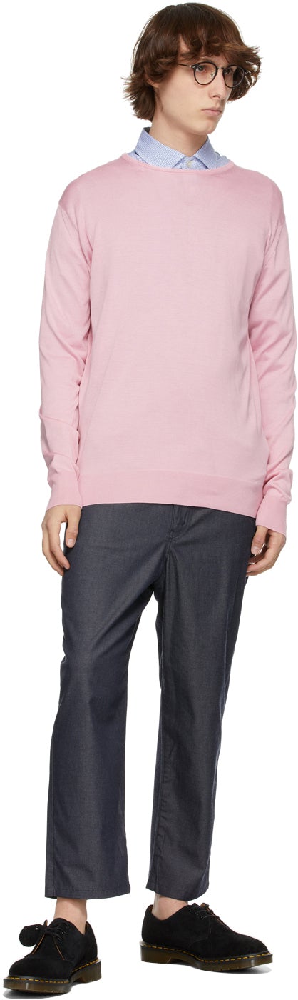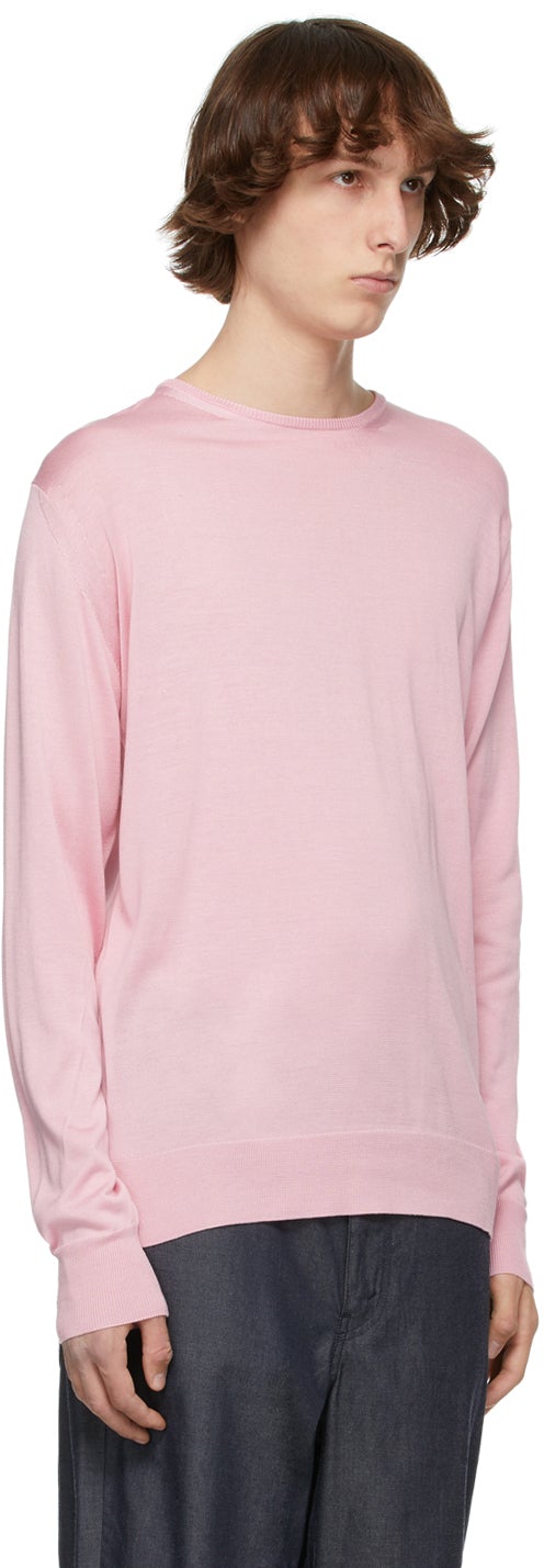 Long sleeve silk jersey sweater in pink. Rib knit crewneck collar, cuffs, and hem. Supplier color: Pink 100% silk. Brand: Junya Watanabe