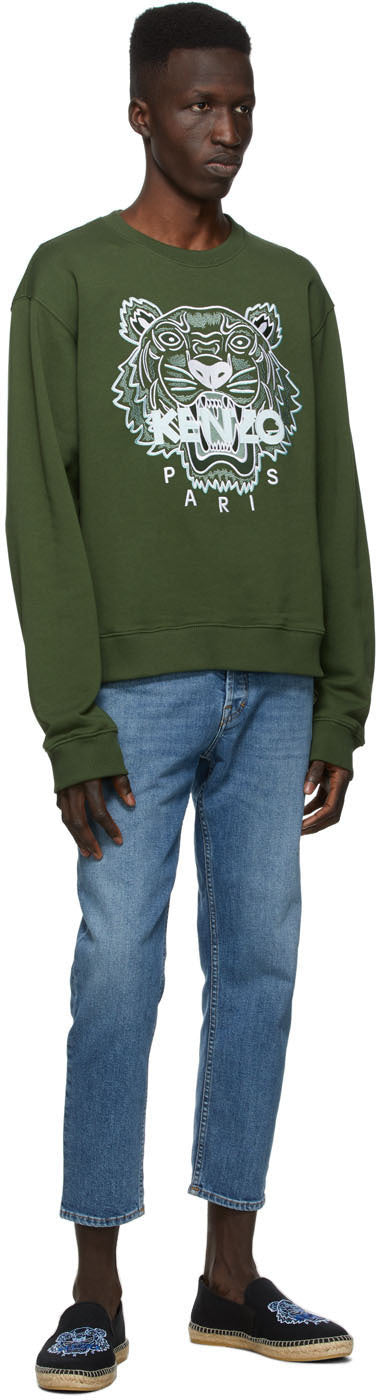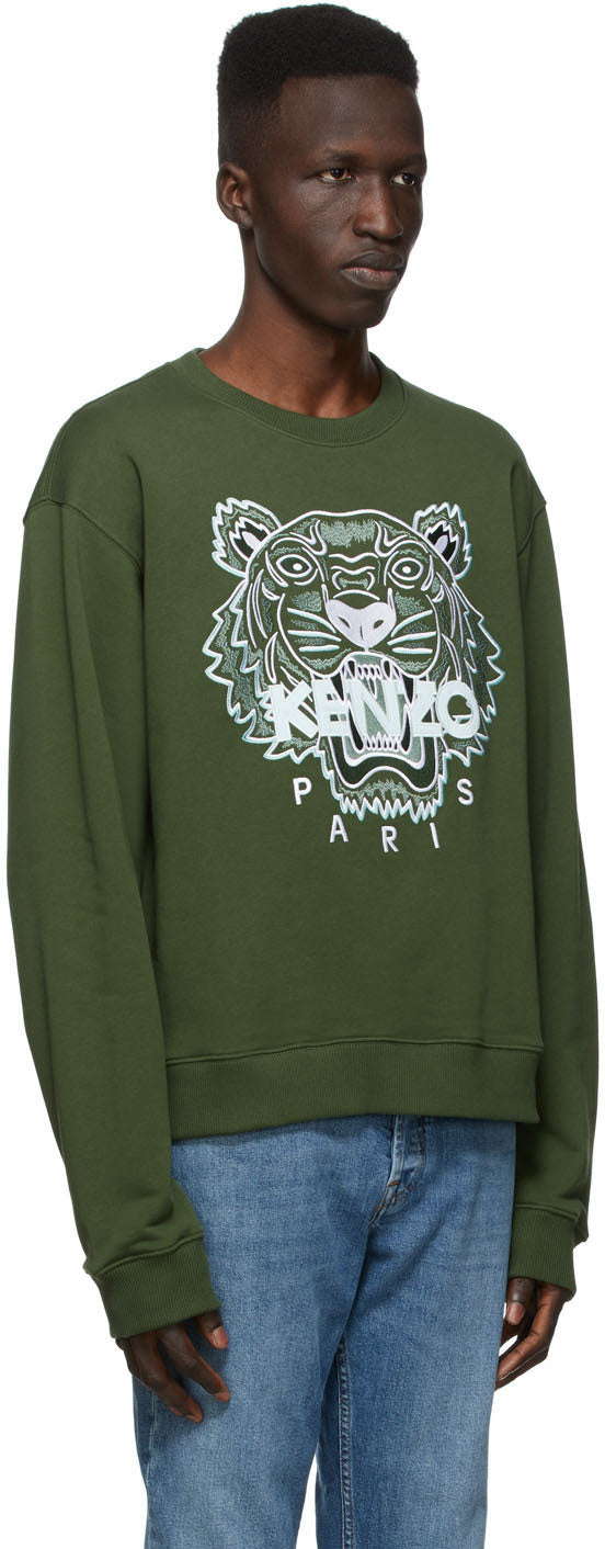 Long sleeve cotton fleece sweatshirt in green. Rib knit crewneck collar, cuffs, and hem. Multicolor logo graphic embroidered at front. Supplier color: Dark khaki 100% cotton. Brand: Kenzo