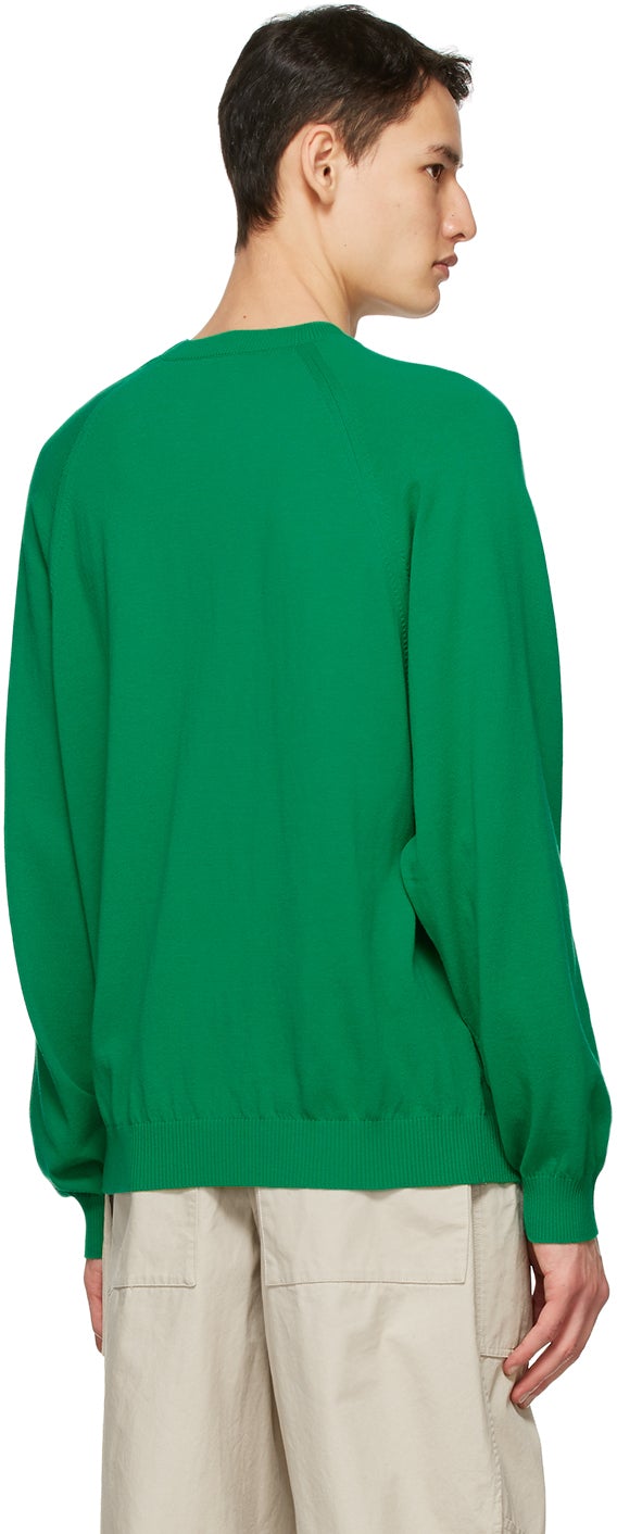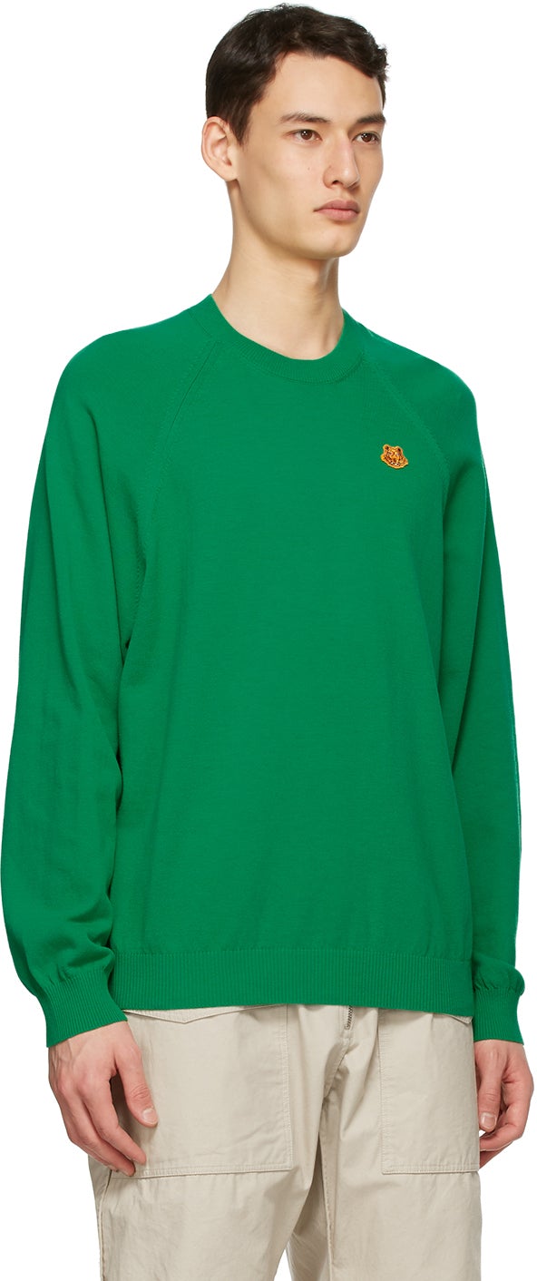 Long sleeve knit cotton sweater in green. Rib knit crewneck collar, cuffs, and hem. Embroidered logo in orange at front. Supplier color: Green 100% cotton. Brand: Kenzo