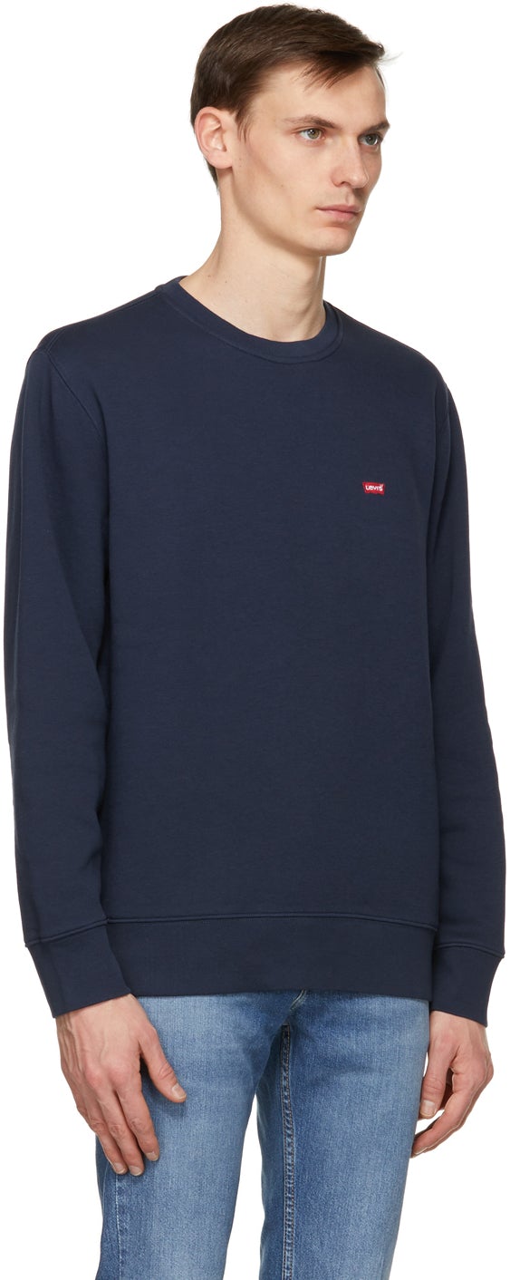 Long sleeve cotton-blend fleece sweatshirt in blue. Rib knit crewneck collar, cuffs, and hem. Embroidered logo patch in red at chest. Supplier color: Dress blue 80% cotton, 20% polyester. Brand: Levi's