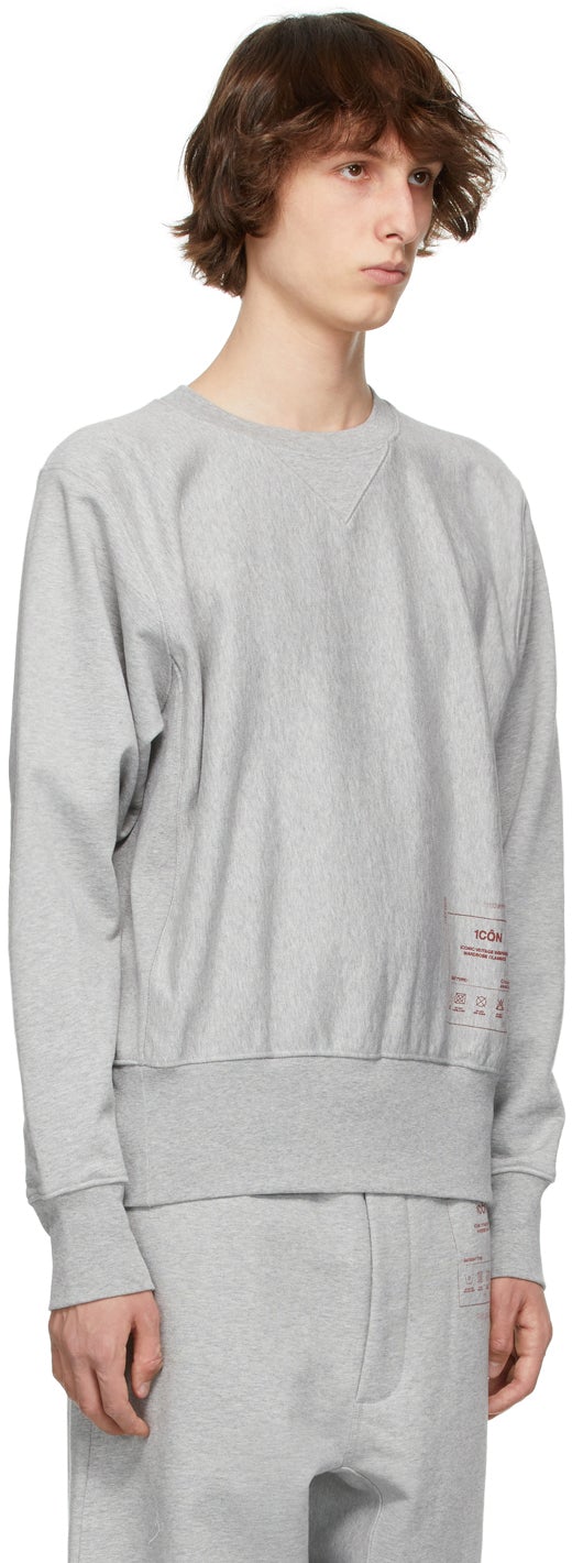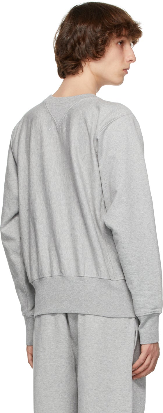 Long sleeve French terry sweatshirt in grey mélange. Rib knit crewneck collar, cuffs, hem, and gusset at side-seams. Graphic printed in burgundy at hem. Signature white stitching at back. Supplier color: Grey mélange 100% cotton. Brand: Maison Margiela