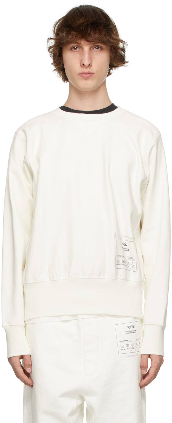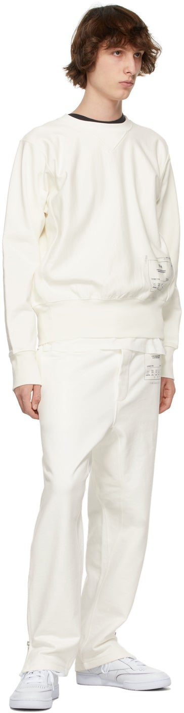 Long sleeve French terry sweatshirt in off-white. Rib knit crewneck collar, cuffs, hem, and gusset at side-seams. Graphic printed in black at hem. Signature white stitching at back. Supplier color: Ivory 100% cotton. Brand: Maison Margiela