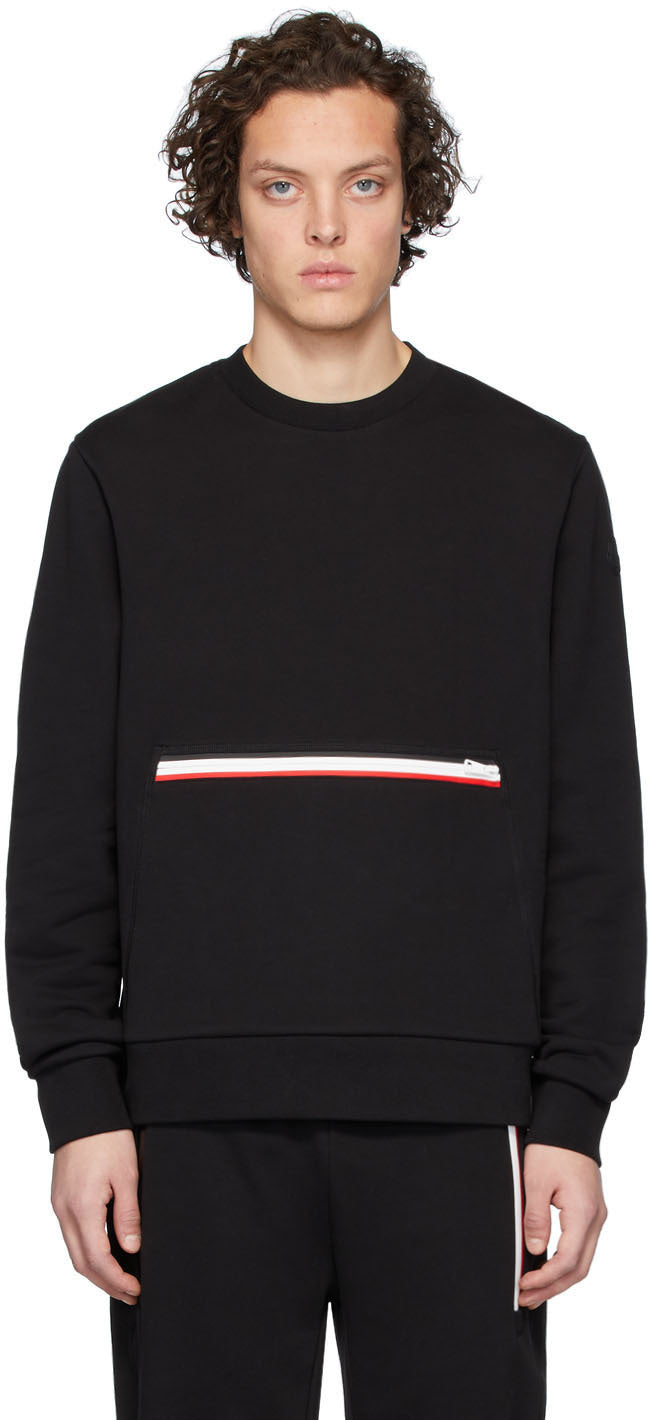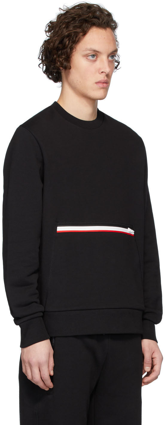 Long sleeve French terry sweatshirt in black. Rib knit crewneck collar, cuffs, and hem. Zippered pocket featuring rubberized stripes in red, white, and black at waist. Tonal rubberized logo appliqué at sleeve. Logo-engraved white hardware. Supplier color: Black 100% cotton. Brand: Moncler