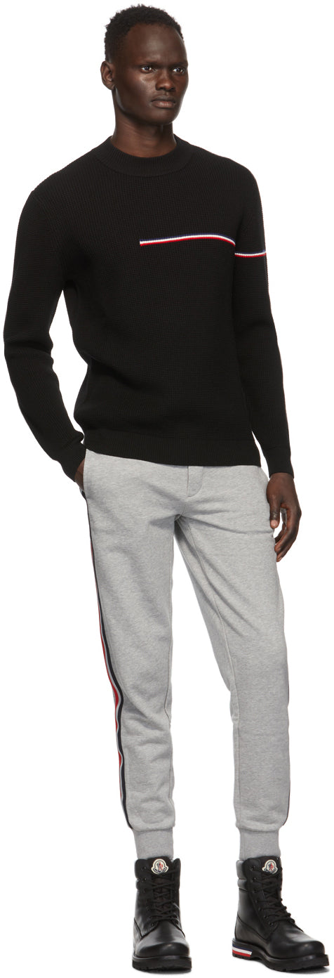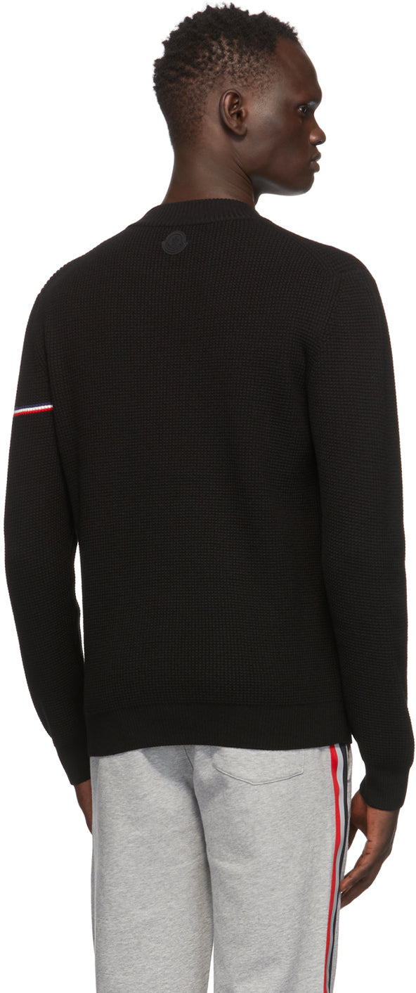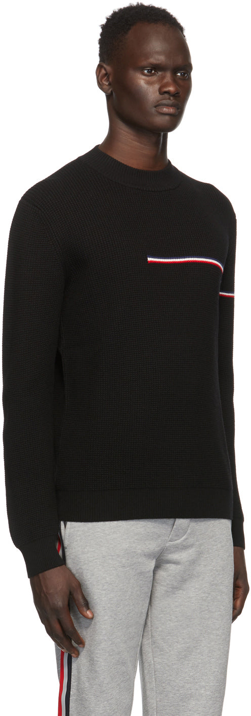 Long sleeve waffle knit virgin wool sweater in black. Rib knit crewneck collar, cuffs, and hem. Intarsia tricolor stripes at front. Rubberized logo appliqué at back. Supplier color: Black 100% virgin wool. Brand: Moncler