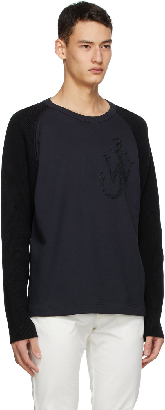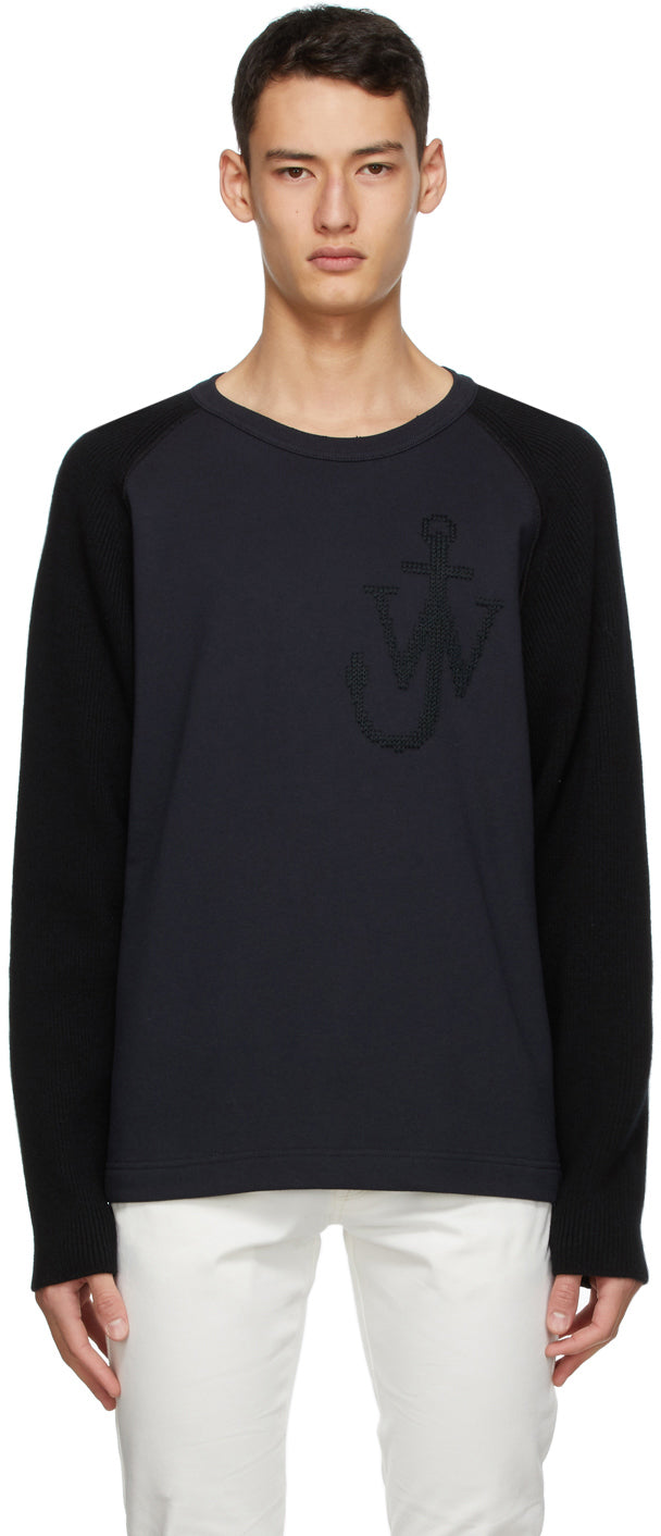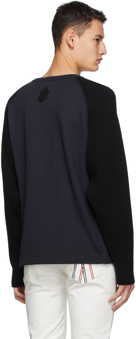 Long sleeve paneled French terry and wool sweater in navy. Crewneck collar. Logo embroidered at chest. Rib knit sleeves with self-tie fastening at cuffs. Felted logo patch at back collar. Part of the 1 Moncler JW Anderson collection. Supplier color: Navy Body 1: 100% cotton. Body 2: 100% virgin wool. Brand: Moncler Genius