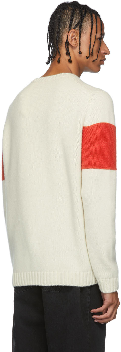 Long sleeve knit wool sweater in beige. Rib knit crewneck collar, cuffs, and hem. Stripe in red and logo embroidered in navy and white at chest. Part of the 2 Moncler 1952 collection. Supplier color: Beige Body: 100% wool. Trim: 50% acrylic, 50% wool. Brand: Moncler Genius