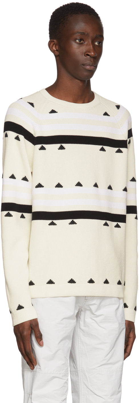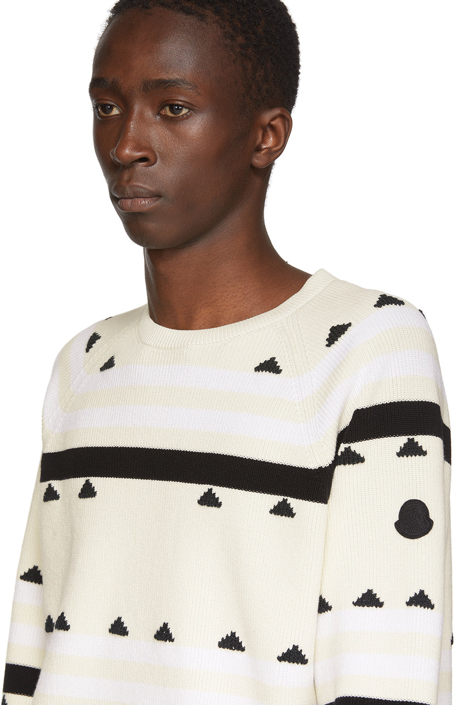 Long sleeve fully-fashioned knit cotton sweater in beige featuring intarsia stripes in black and white and graphic pattern in black throughout. Rib knit crewneck collar, cuffs, and hem. Part of the 2 Moncler 1952 collection. Supplier color: Beige 100% cotton. Brand: Moncler Genius