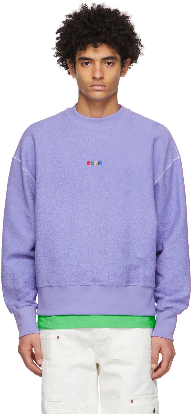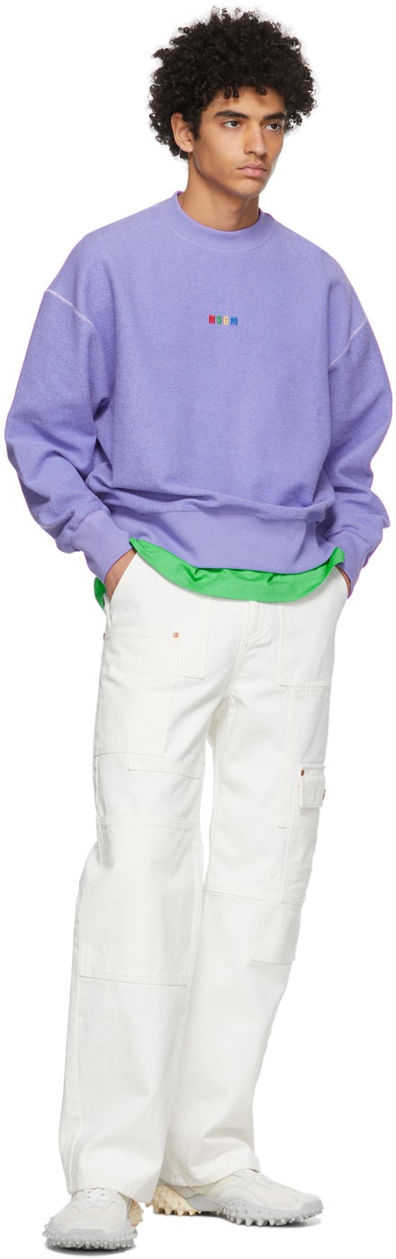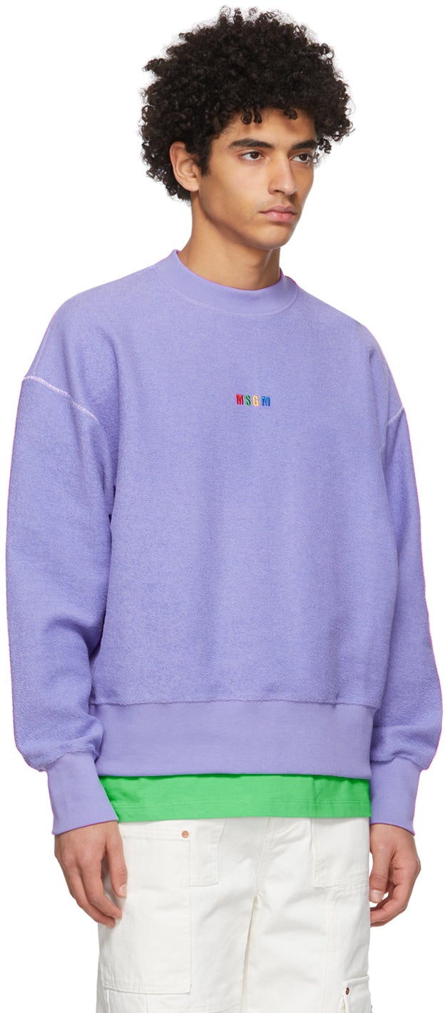 Long sleeve French terry sweatshirt in purple. Rib knit crewneck collar, cuffs, and hem. Logo embroidered in multicolor at chest. Contrast stitching in white. Supplier color: Wisteria 100% cotton. Brand: MSGM