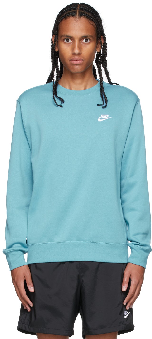Long sleeve cotton-blend fleece sweatshirt in blue. Rib knit crewneck collar, cuffs, and hem. Swoosh and logo embroidered in white at chest. Supplier color: Cerulean/White 80% cotton, 20% polyester. Brand: Nike