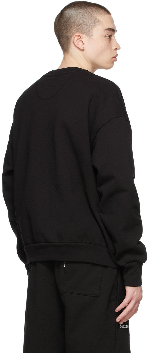 Long sleeve garment-dyed cotton fleece sweatshirt in black. Rib knit crewneck collar, cuffs, and hem. Dropped shoulders. Tonal textile logo patch at side-seam. Supplier color: Black 100% cotton. Brand: Noon Goons