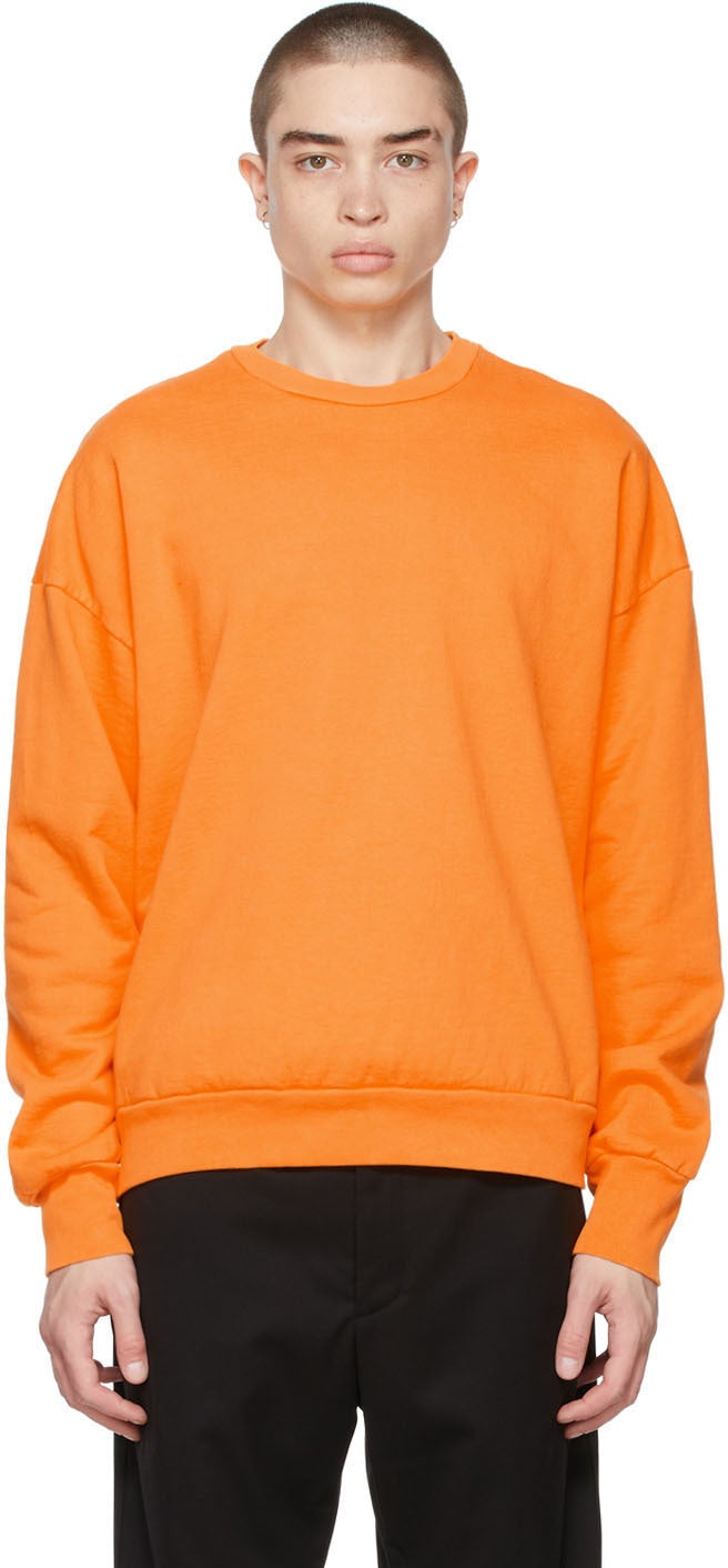 Long sleeve garment-dyed cotton fleece sweatshirt in orange. Rib knit crewneck collar, cuffs, and hem. Dropped shoulders. Textile logo patch in black at side-seam. Supplier color: Warm orange 100% cotton. Brand: Noon Goons