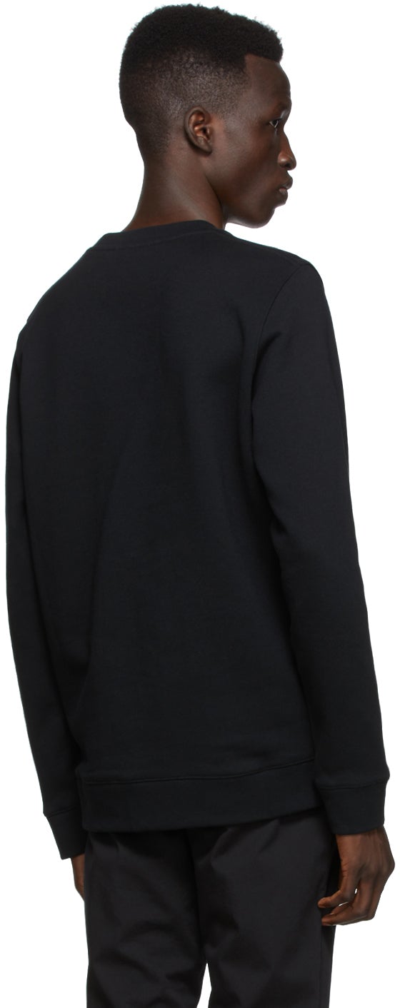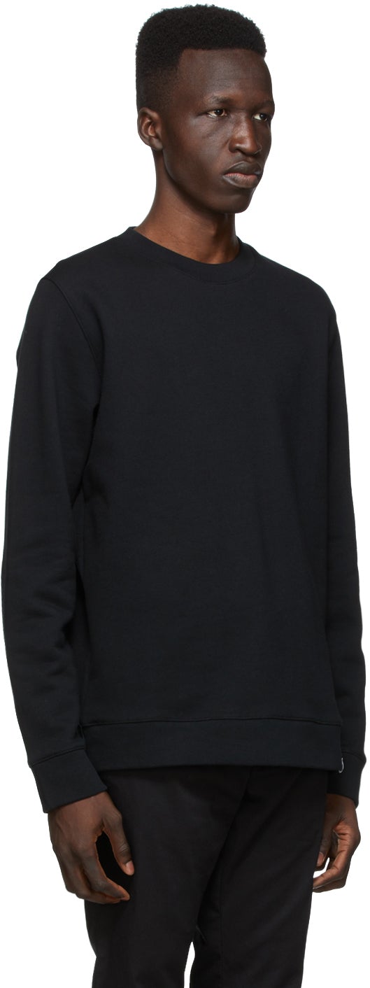 Long sleeve French terry sweatshirt in black. Rib knit crewneck collar, cuffs, and hem. Logo flag in black and white at hem. Supplier color: Black 100% cotton. Brand: Norse Projects