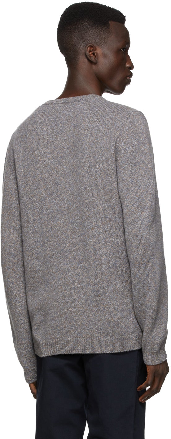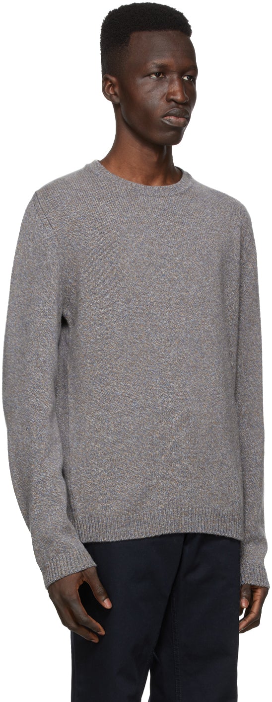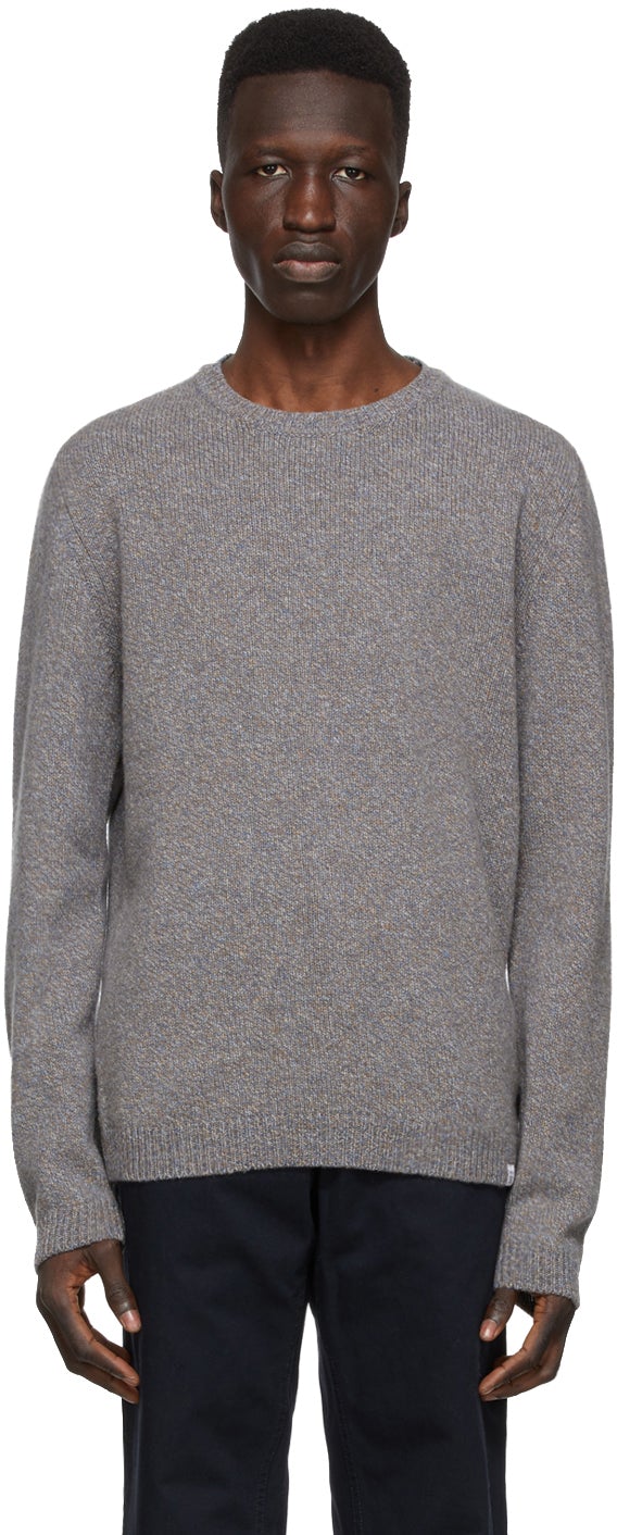 Long sleeve knit lambswool sweater marled in tones of grey, blue, and orange. Rib knit crewneck collar, cuffs, and hem. Logo flag at hem. Supplier color: Scoria blue 100% lambswool. Brand: Norse Projects