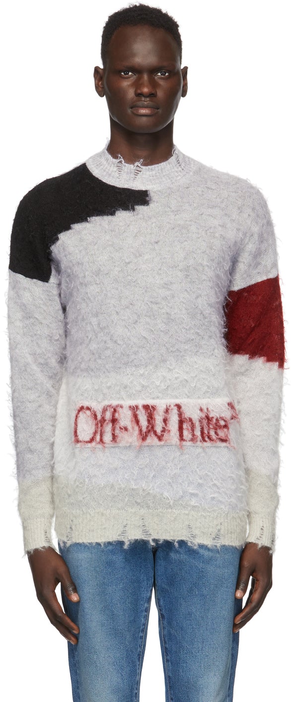 Long sleeve mohair and wool-blend sweater in grey, white, red, and black. Distressing throughout. Rib knit mock-neck collar, cuffs, and hem. Logo embroidered at waist. Supplier color: Grey/Red 50% mohair, 30% polyamide, 20% wool. Brand: Off-White
